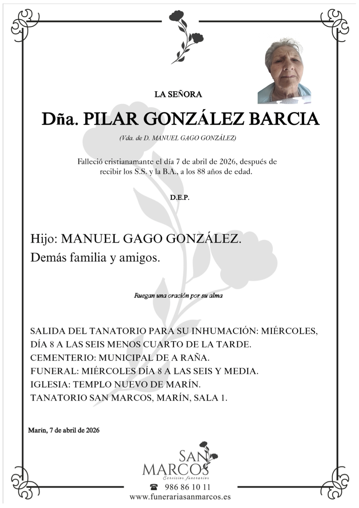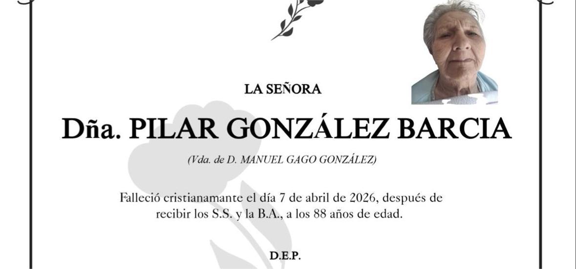 La funeraria SAN MARCOS comunica el fallecimiento HOY, día 7 de abril de doña PILAR GONZÁLEZ BARCIA cuyos restos mortales permanecerán en el Tanatorio San Marcos, de Marín, sala número 1, hasta el momento de su traslado mañana MIÉRCOLES día 8 a las SEIS MENOS CUARTO de la tarde para su inhumación en el cementerio municipal de A RAÑA