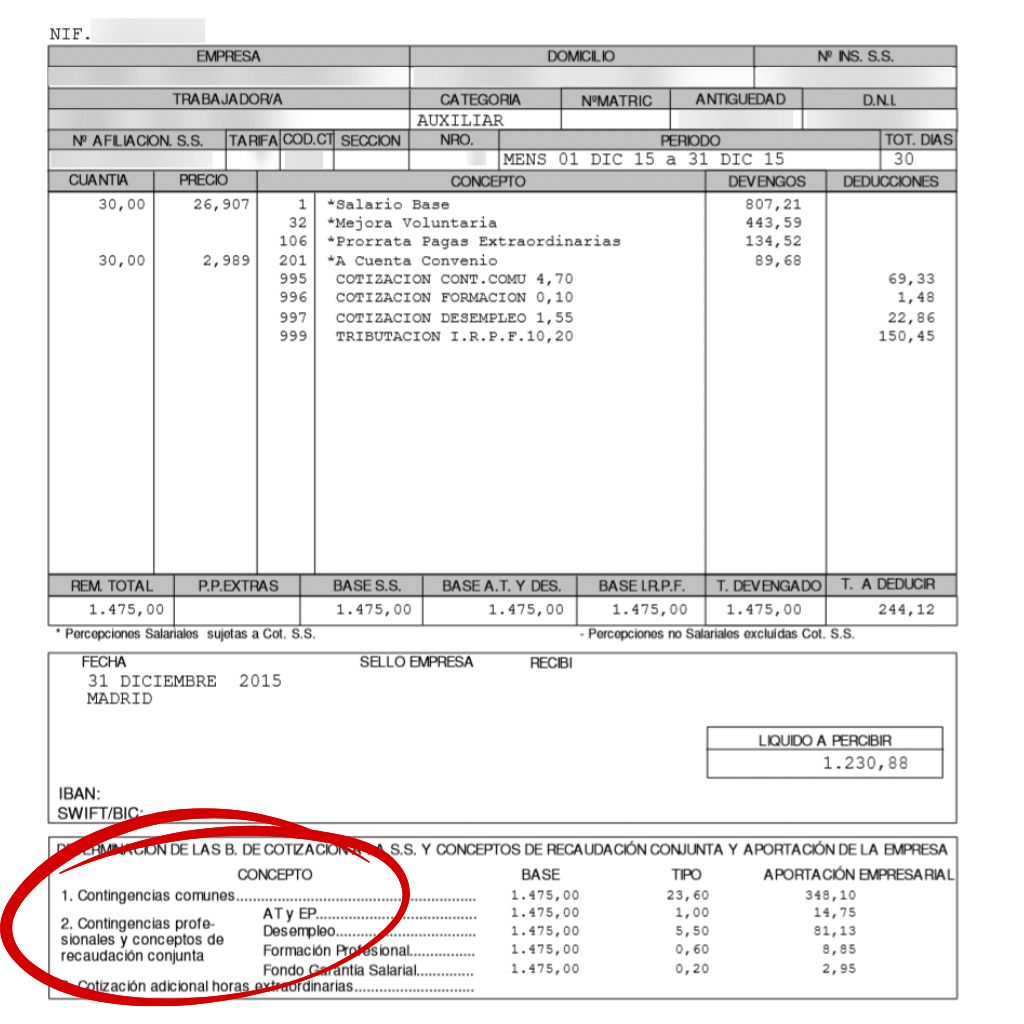 Traducido a un lenguaje normal: si alguien quiere aproximarse a cuánto va a cobrar estando de baja, uno de los primeros sitios donde debe mirar es la nómina del mes anterior al inicio de la baja, concretamente los apartados llamados “CONTINGENCIAS COMUNES” o “CONTINGENCIAS PROFESIONALES” según sea el caso. Dichos apartados suelen estar situados en la parte de abajo de la nómina.