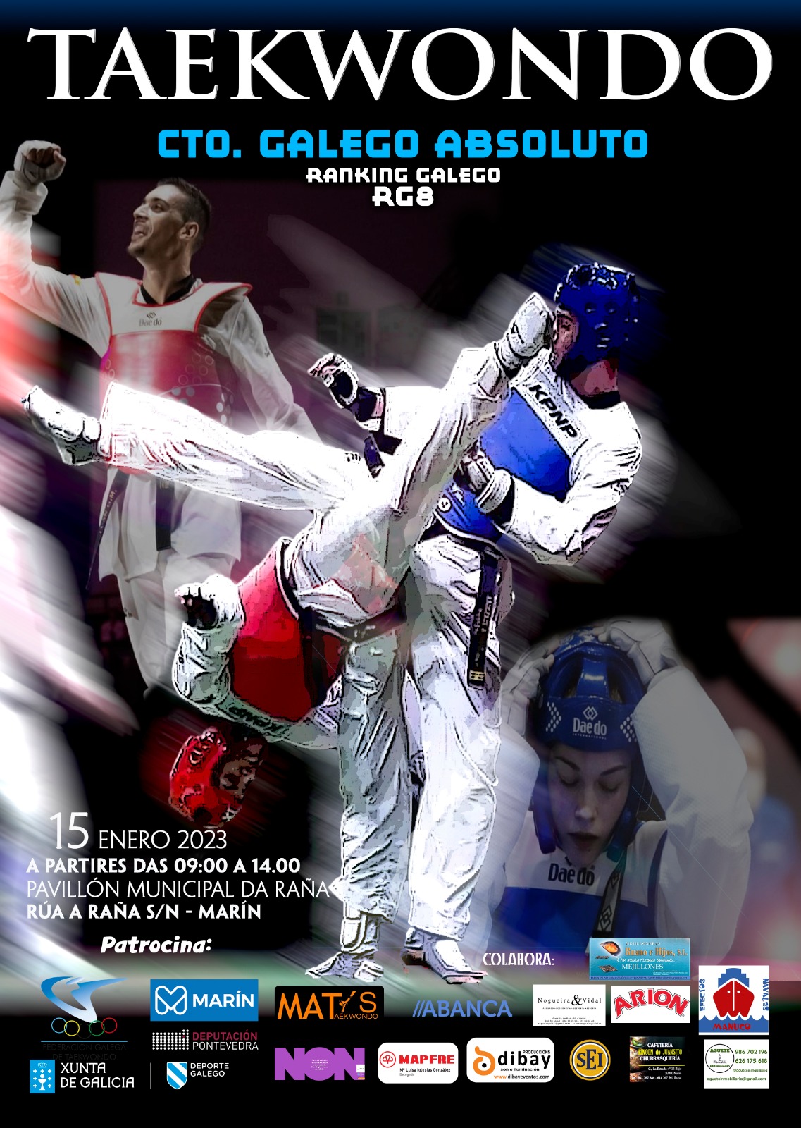 Cerca de un centenar de deportistas del Taekwondo pertenecientes a veintidós clubs de la Comunidad Autónomas, participarán en el Campeonato Gallego de la especialidad que se celebrará el próximo domingo, día 15 en el Pabellón Municipal de A Raña
