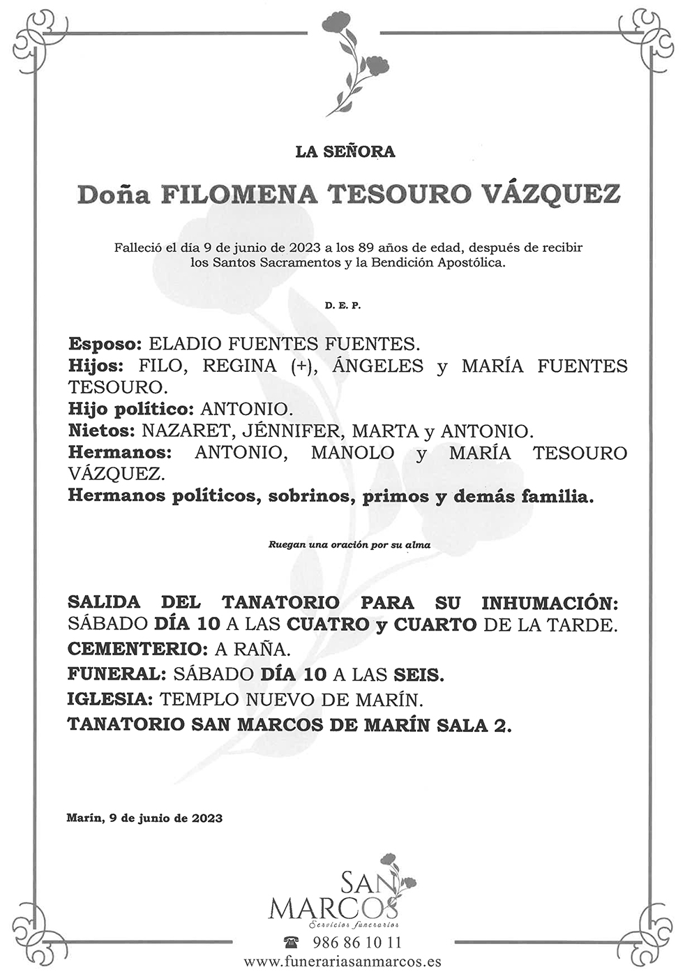 Falleció el día 9 de Junio de 2023 después de recibir los Santos Sacramentos y la Bendición Apostólica. Su esposo Eladio Fuentes Fuentes. Hijos Regina, Ángeles, y María Fuentes Tesouro. Hijo político Antonio. Nietos Nazaret, Jennifer, Marta y Antonio. Hermanos Antonio, Manolo y María Tesouro Vázquez. Hermanos políticos, sobrinos, primos y demás familia ruegan una oración por su alma.