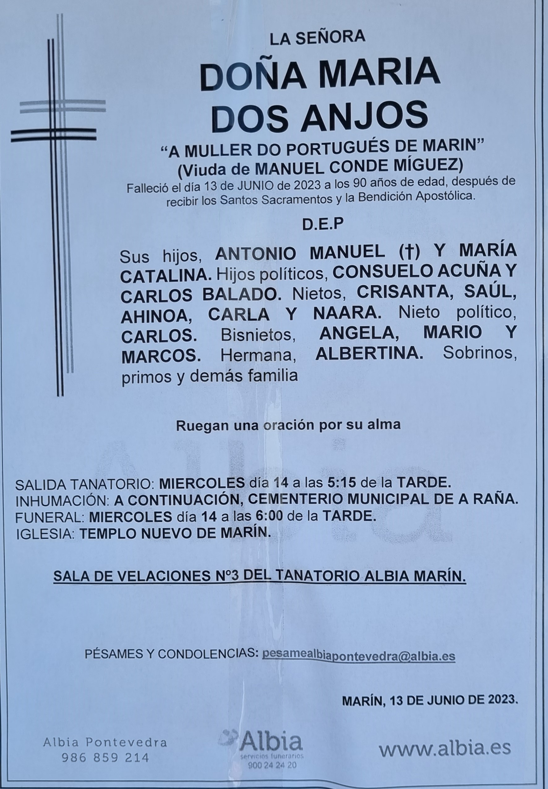 Sentido fallecimiento de María dos Anjos, viuda de Manuel Conde, “O Portugués” matrimonio de la hostelería que regentó, precisamente el bar “O Portugués” que se encontraba en las galerías de la calle Real. Es además madre de Catalina Manso, presidenta de la asociación comercial Estrela de Marín y propietaria de un comercio precisamente en la entrada de las mismas galerías y también