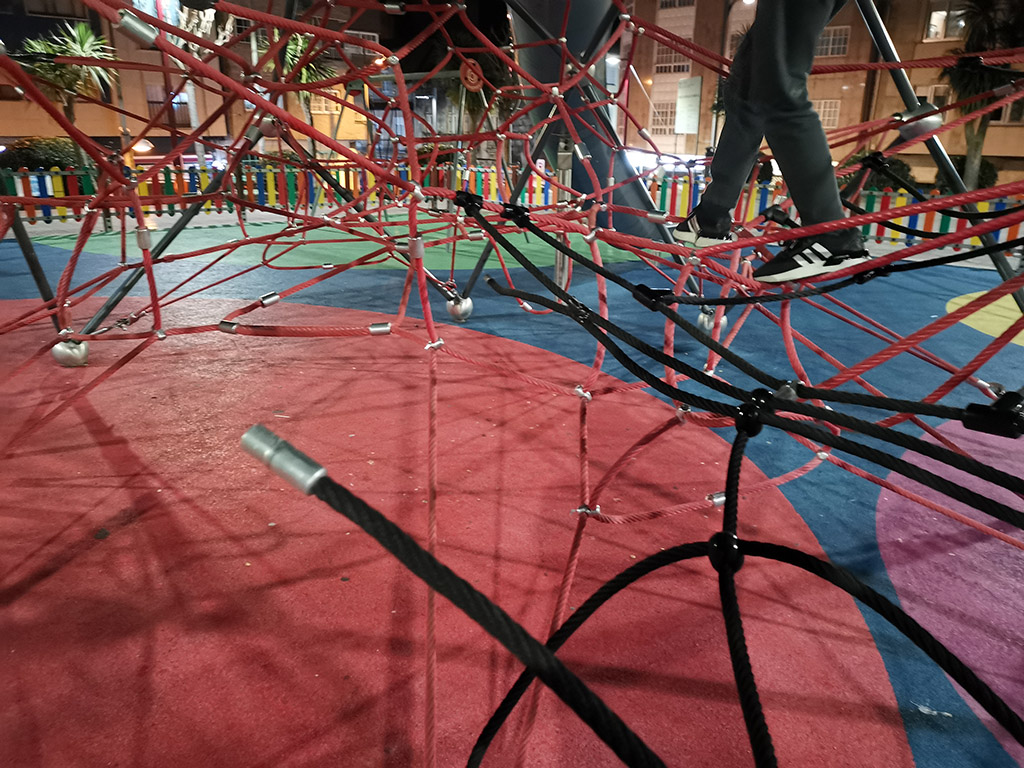 Es lógico que con el paso del tiempo las cosas se vayan desgastando y algunos elementos, como éste de la foto, terminan estropeándose. Pero en el caso que nos ocupa, por antigüedad, nada más que el mal uso, o incluso la mala fe, justifican la rotura de un robusto elemento de este parque que es prácticamente nuevo, el puente hecho de malla de cuerda que une uno de los toboganes con la pared de escalada.