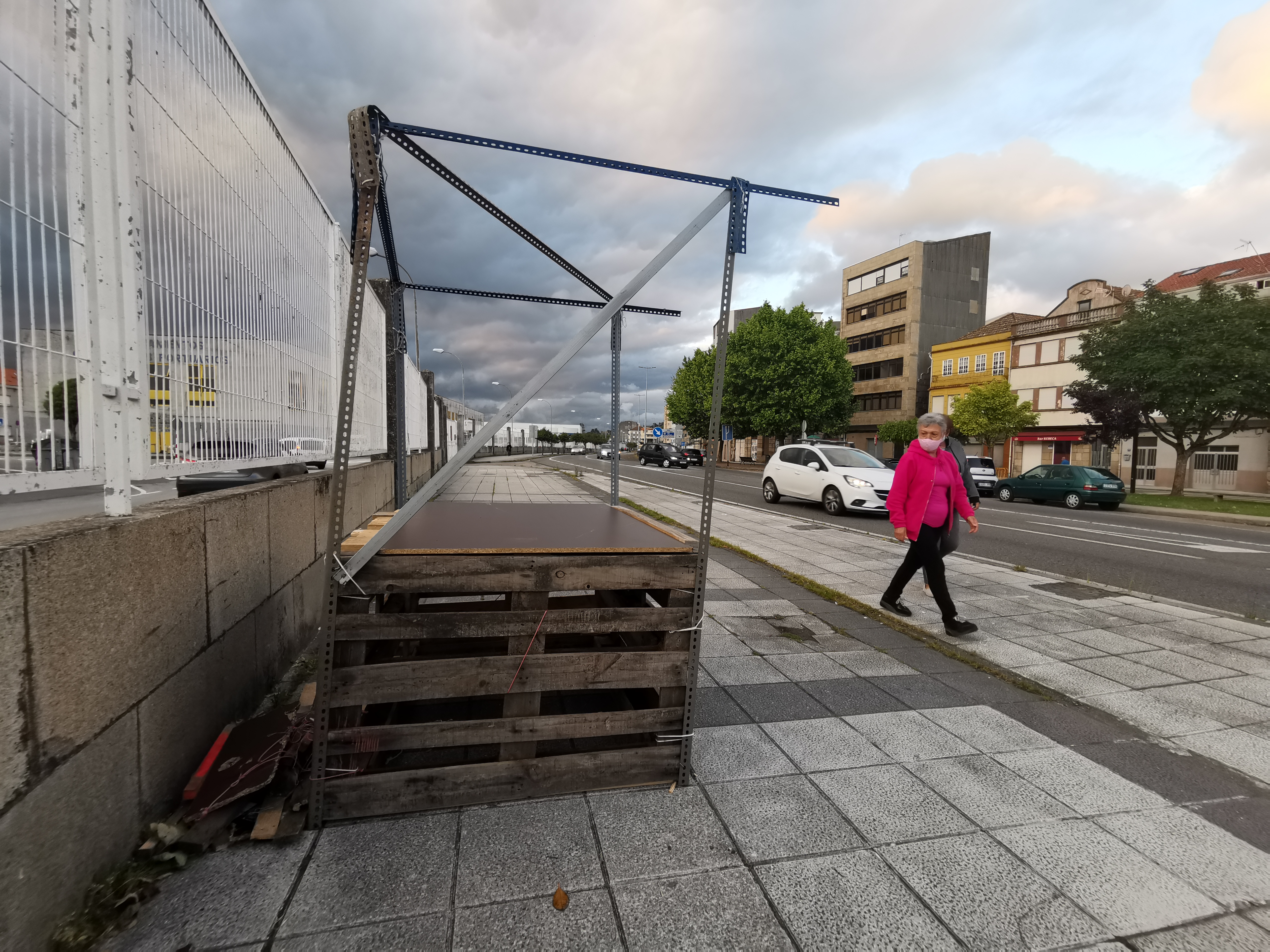 Varios avisos en la tarde de ayer de algunos viandantes que utilizan el paseo que comienza en la Avenida de Ourense y termina en Placeres, junto a la entrada principal del Puerto de Marín nos alertaban de la instalación de una especie de kiosco de venta o similar en plena acera, ya en término municipal de Pontevedra. Desconocemos el origen y el objetivo de la construcción, fabricada con restos de estanterías y pallets, pero es evidente que no es este un buen lugar para su situación.