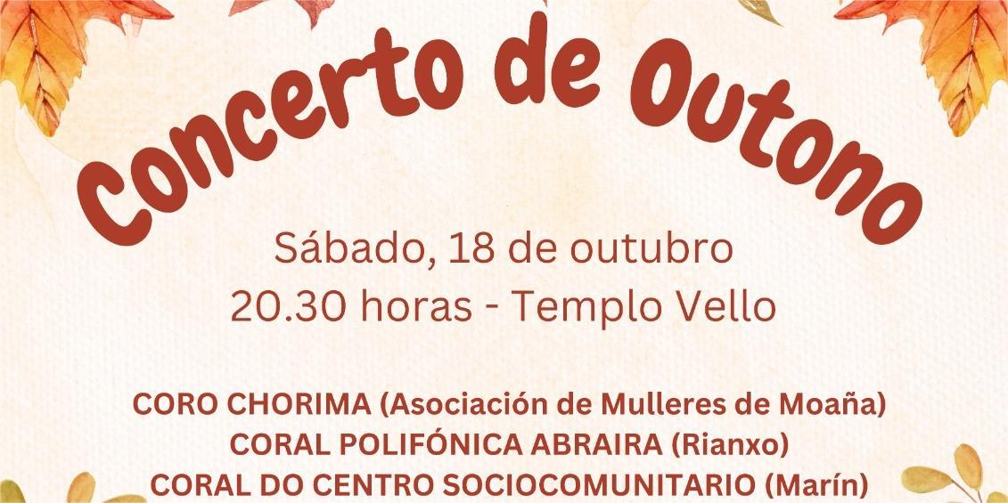 Tres corales polifónicas se reúnen esta tarde, a partir de las ocho y media en el Antiguo Templo para participar en una nueva edición del “Concerto de Outono” organizado por la “Coral del Cenro Sociocomunitario de Marín” que compartirá actuación con las agrupaciones “Coro Chorima”, de la Asociación de Mulleres de Moaña, y “Abraira”, procedente de Rianxo.