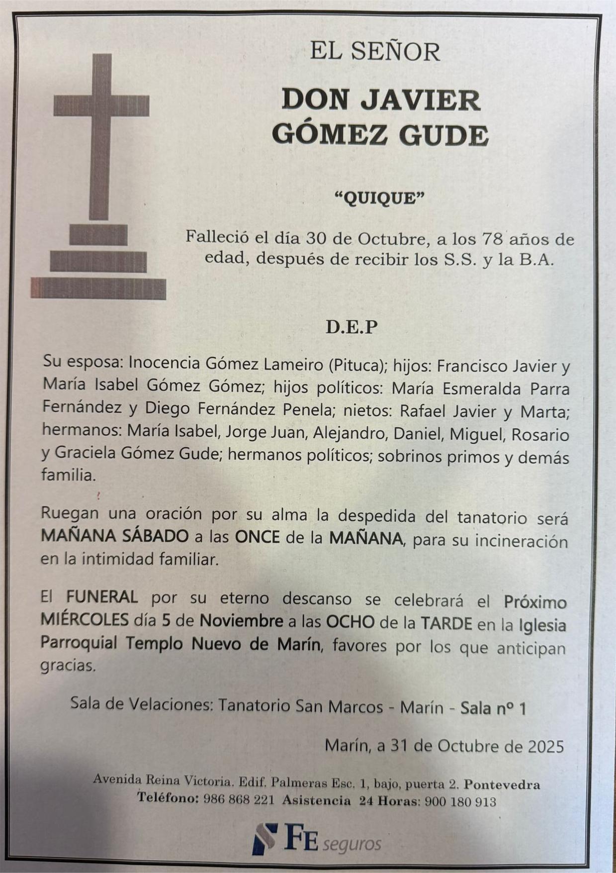 La funeraria LA FE comunica el fallecimiento de Don JAVIER GÓMEZ GUDE cuyos restos mortales permanecerán en el tanatorio SAN MARCOS de Marín, sala número 1, hasta el momento de su traslado, mañana sábado día 1 de noviembre a las once de la mañana para su incineración en la intimidad familiar.