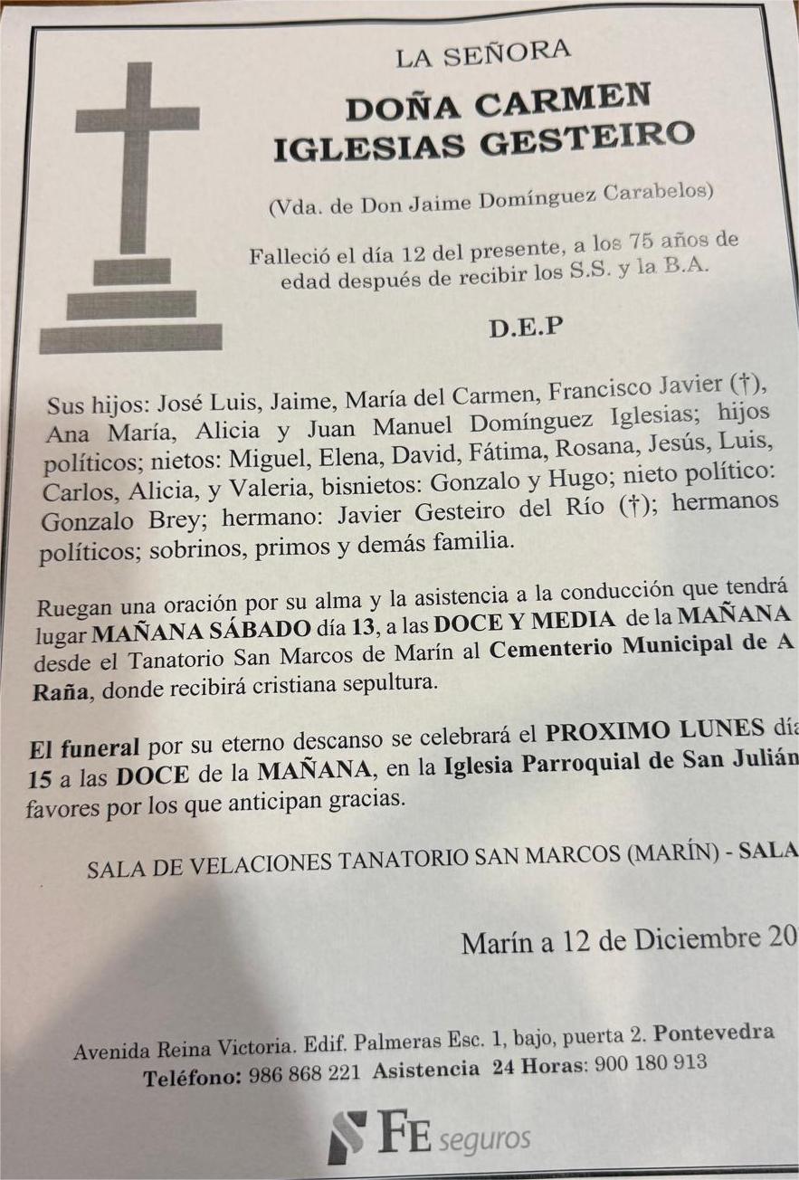 La funeraria LA FE comunica el fallecimiento hoy día 12 de diciembre de Doña CARMEN IGLESIAS GESTEIRO cuyos restos mortales permanecerán en el tanatorio San Marcos de MARÍN, sala nº 1, hasta el momento de su traslado, mañana SÁBADO, día 13, a las DOCE Y MEDIA del mediodía, al cementerio municipal de A Raña para su inhumación.