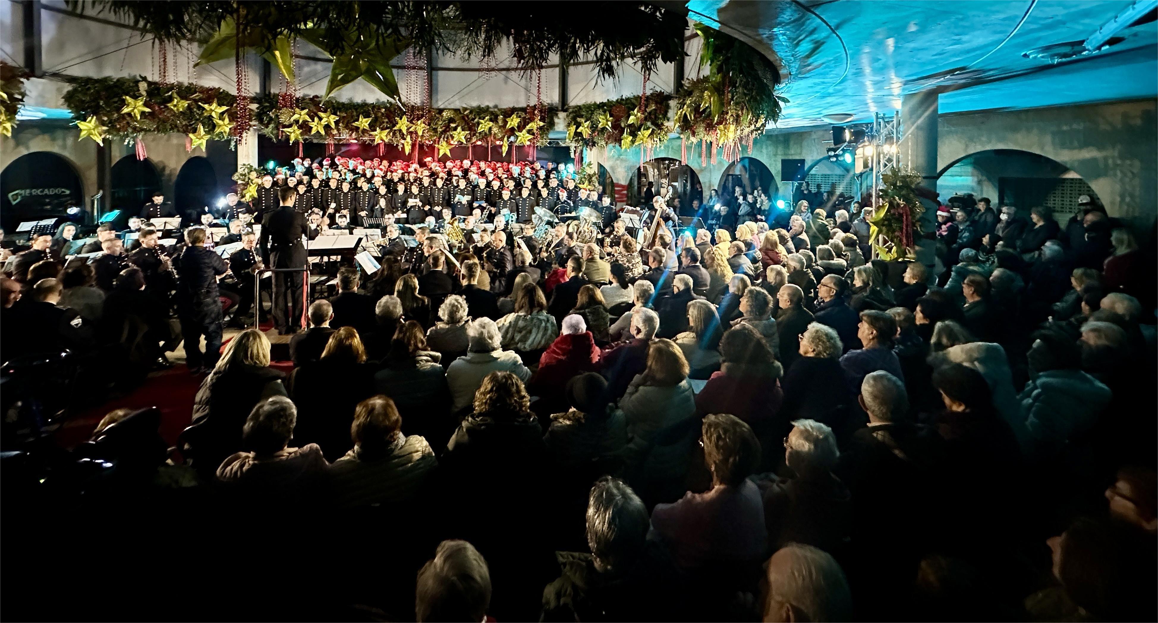 La Banda de Música de la Escuela Naval Militar acompañada del coro de los alumnos y alumnas de primer curso de la Academia de la Armada ofreció ayer un extraordinario concierto navideño que fue disfrutado por un público que abarrotó el engalanado multiusos aunque, una gran parte del mismo, tuvo que conformarse con presenciarlo de pie por la incapacidad del recinto para un acto de tal categoría