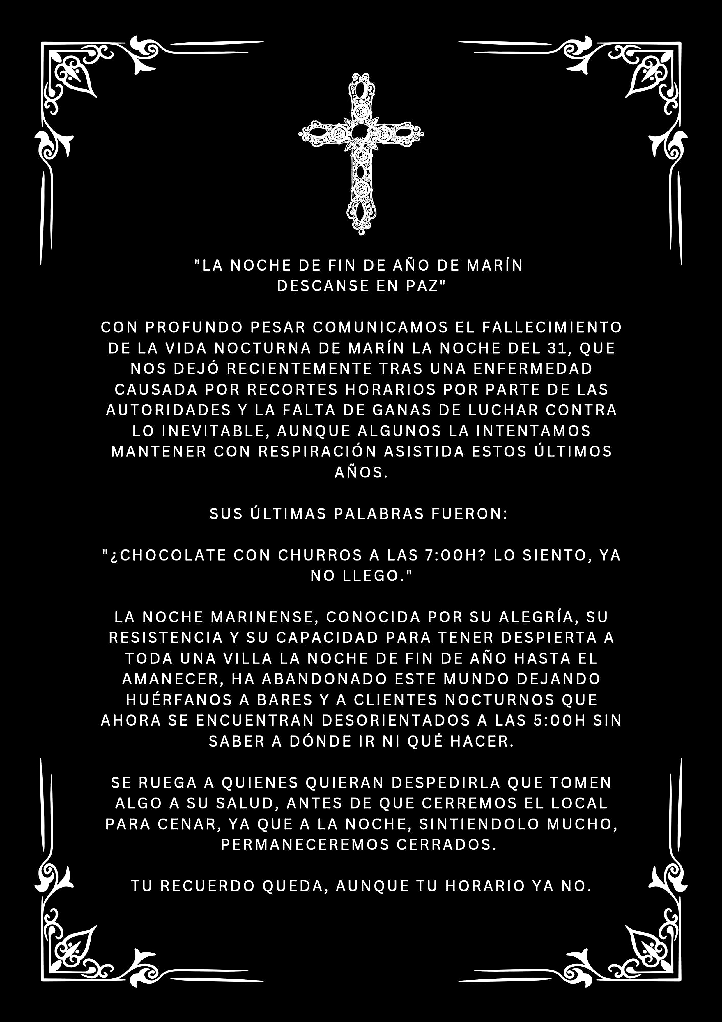 La esquela incluye un texto irónico pero cargado de aflicción que, por resumirlo de alguna manera, da por muerta la fiesta en Marín, en concreto la de Fin de Año a causa de las limitaciones horarias impuestas desde el gobierno local. El texto se cierra con el anuncio, todavía más doloroso, de que ese negocio hostelero, en señal de protesta, decide que no abrirá sus puertas esa noche.