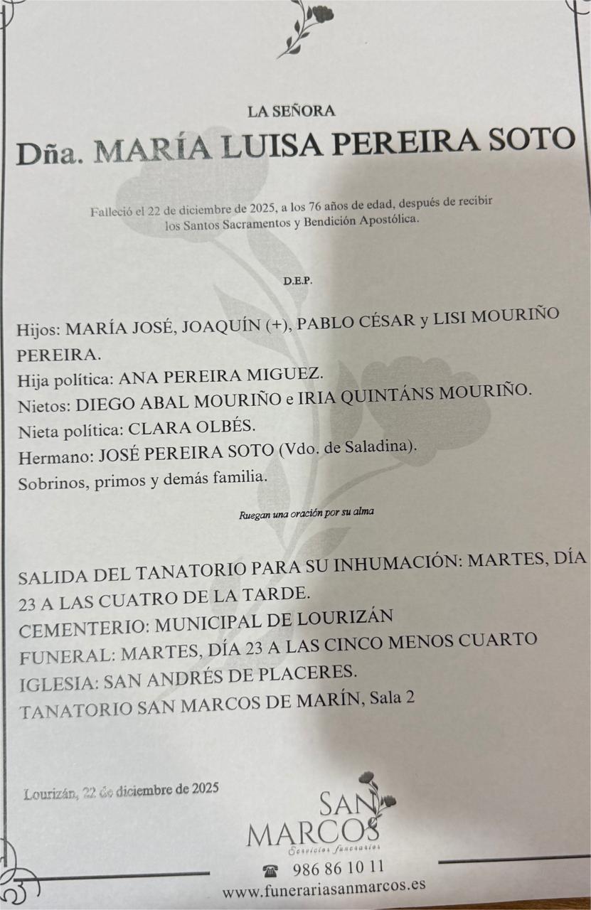 La funeraria SAN MARCOS comunica el fallecimiento hoy día 22 de diciembre de Doña MARÍA LUISA PEREIRA SOTO cuyos restos mortales permanecerán en el tanatorio San Marcos de MARÍN,sala número 2 hasta el momento de su traslado, MAÑANA MARTES, día 23 a las CUATRO de la tarde para su inhumación en el cementerio municipal de Lourizán.