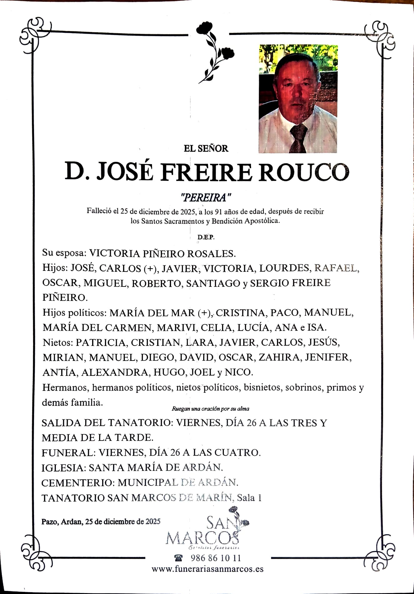 La funeraria SAN MARCOS comunica el fallecimiento hoy día 25 de diciembre, de Don JOSÉ FREIRE ROUCO cuyos restos mortales permanecerán en el tanatorio San Marcos de Marín, sala número 1, hasta el momento de su traslado, MAÑANA VIERNES, día 26 a las TRES Y MEDIA de la tarde para su inhumación en el cementerio municipal de Ardán.