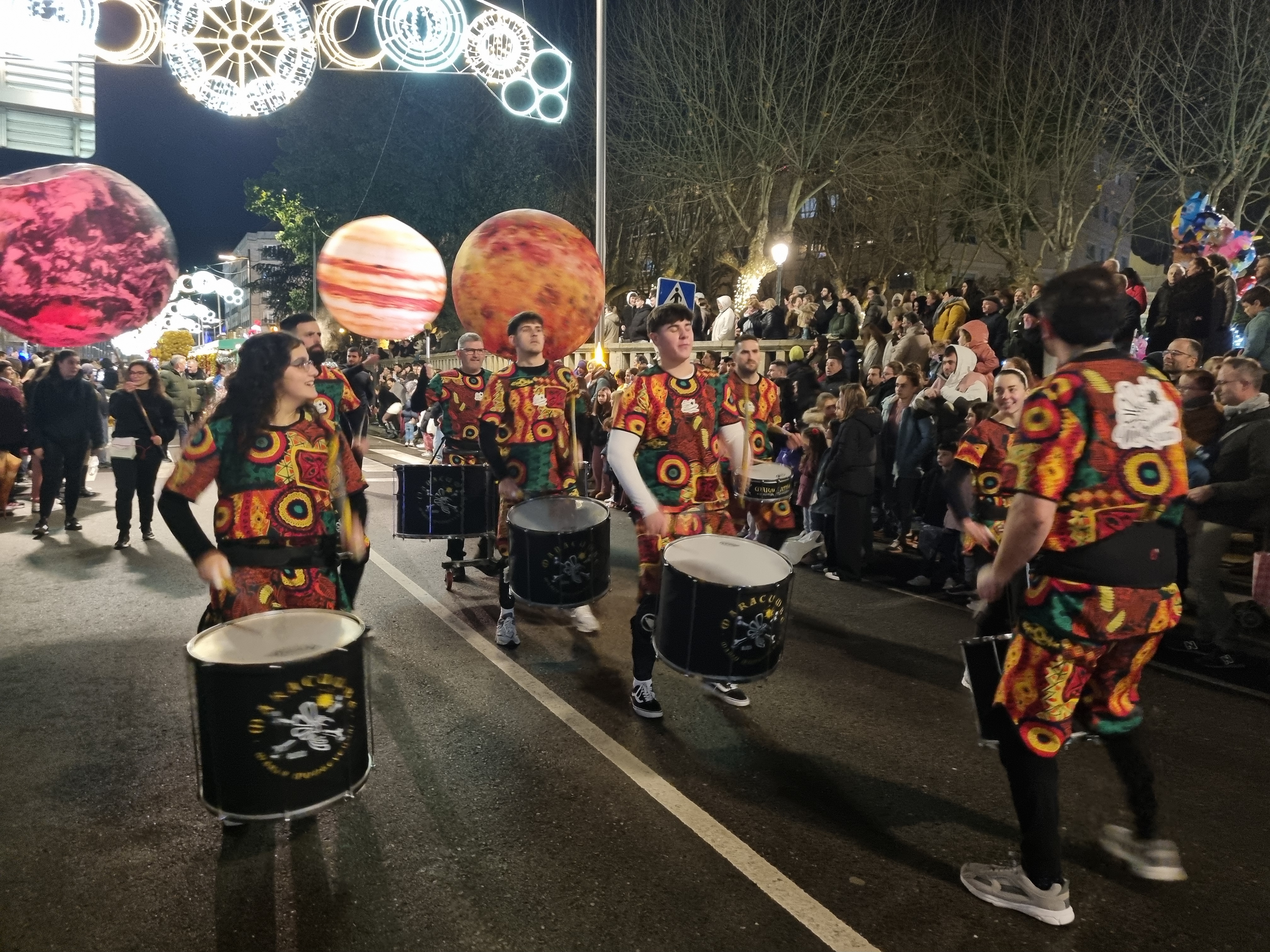 Las tres carrozas llenas de niñas y niños ataviados debidamente según el motivo de las mismas, desfilaron alternadas con grupos de música y batucadas que llenaron el recorrido de ritmo mientras volaban cientos de kilos de caramelos desde las carrozas a las manos de quienes presenciaban su paso.