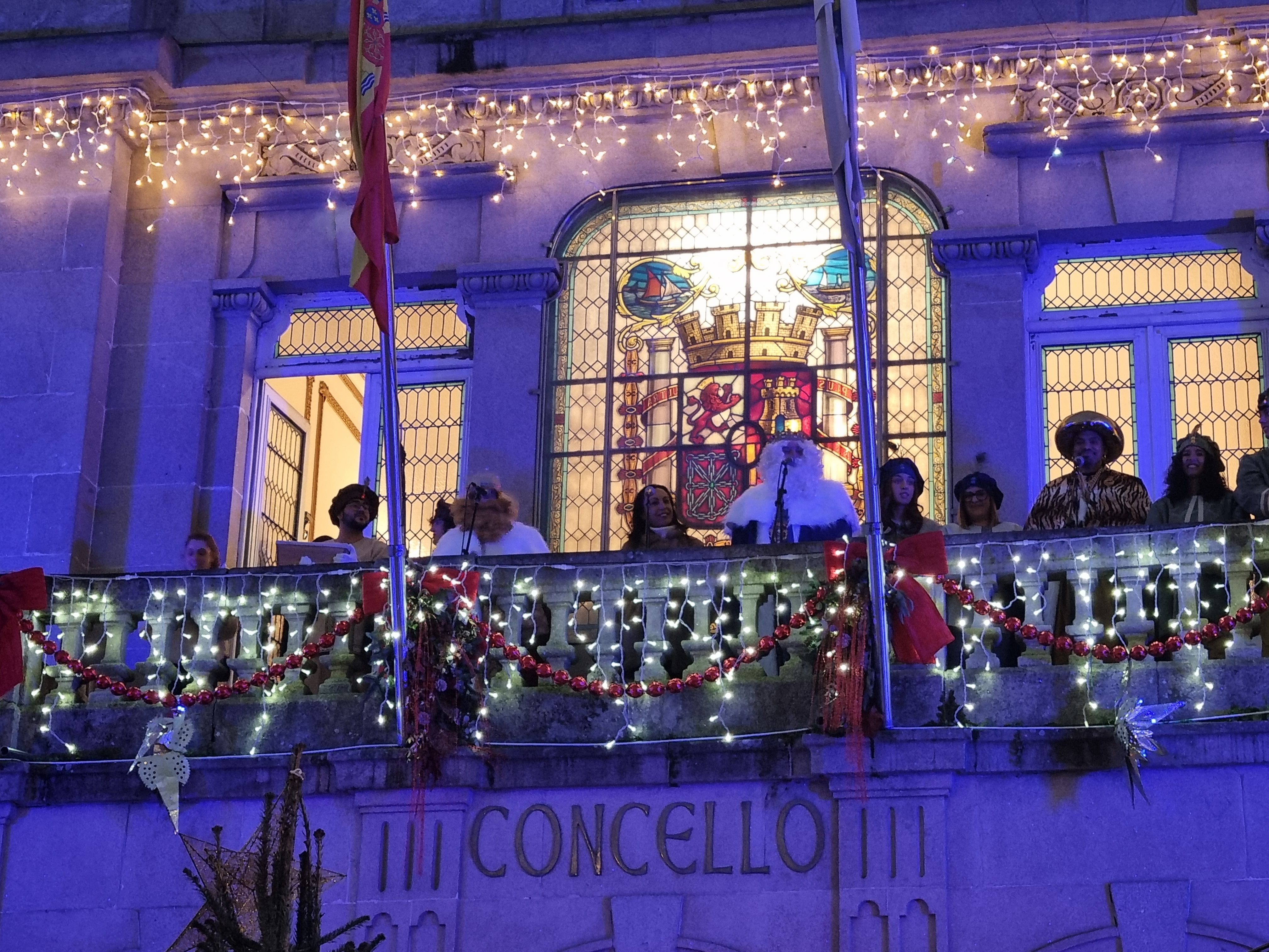 Los tres Magos acompañados de la alcaldesa María Ramallo salieron al balcón de la fachada principal del Concello y, desde allí, tras la presentación hecha por la regidora, los tres Magos dirigieron sendos breves discursos a los numerosos asistentes que llenaban la plaza.