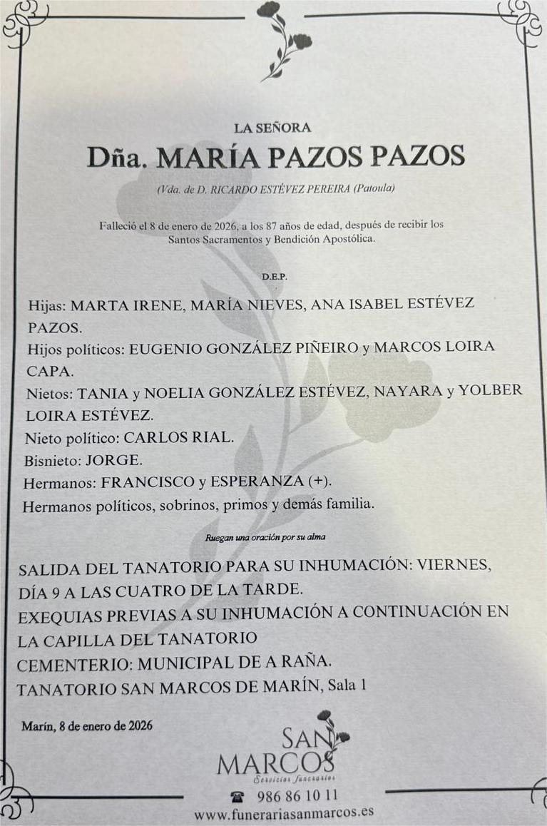 La funeraria SAN MARCOS comunica el fallecimiento HOY, día 8 de enero, de Doña MARÍA PAZOS PAZOS cuyos restos mortales permanecerán en el tanatorio San Marcos, de Marín, sala número 1, hasta el momento de su traslado, mañana viernes día 9 a las cuatro de la tarde al cementerio municipal de A Raña .