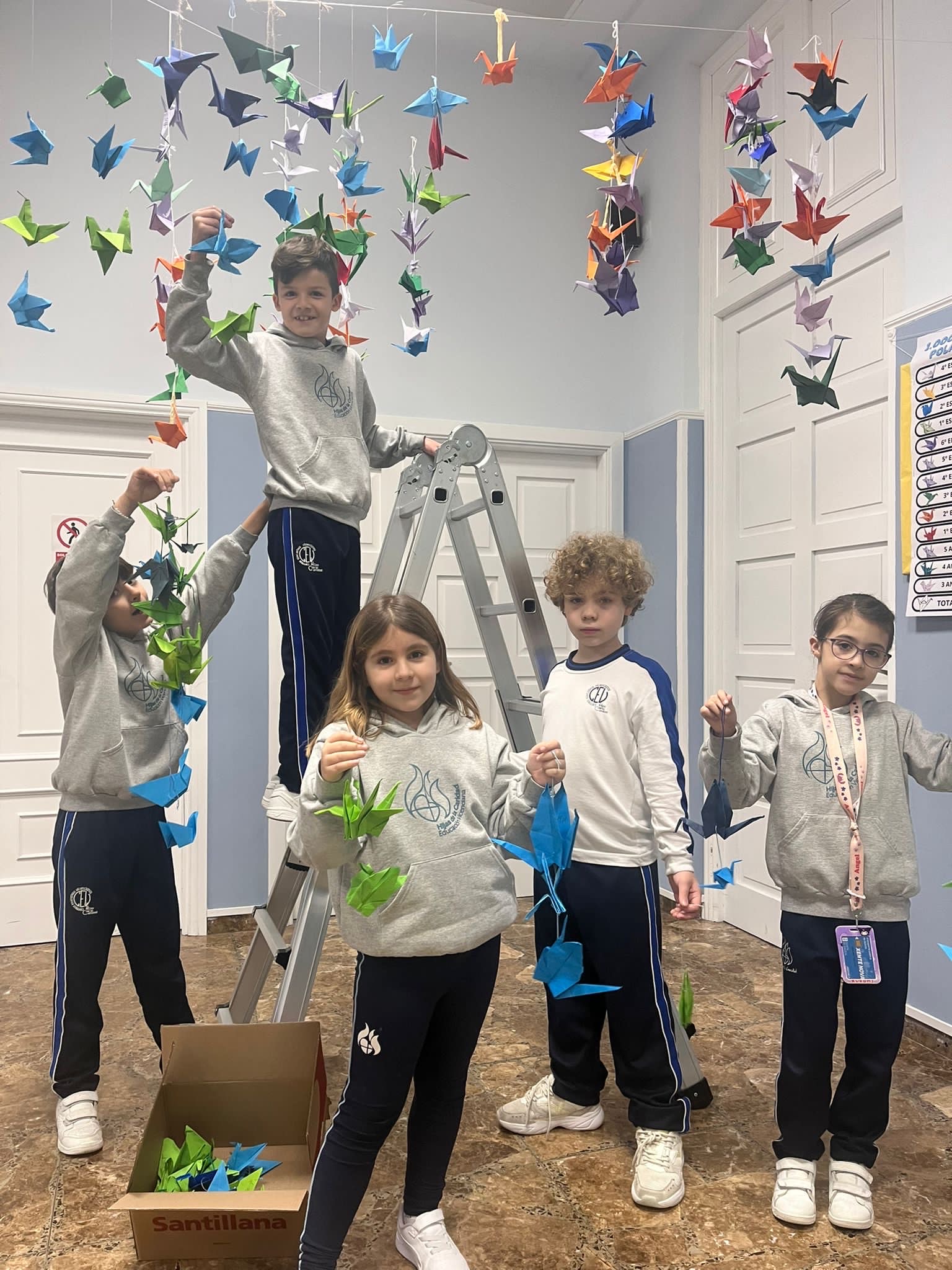 Inspirado en esta historia, el CPR La Inmaculada de Marín ha lanzado un reto común a todo el alumnado del centro: la creación de 1.000 grullas por la paz. Cada clase ha participado activamente en la elaboración de estas figuras, que simbolizan deseos, compromisos y reflexiones en favor de un mundo más justo, solidario y libre de violencia. Todas las grullas se reunirán y expondrán conjuntamente en el hall del colegio como mensaje visible de concienciación y sensibilización.