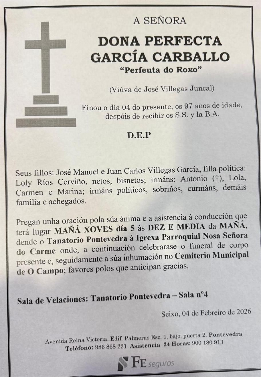 La funeraria LA FE comunica el fallecimiento hoy, día 4 de enero, de doña PERFECTA GARCÍA CARBALLO cuyos restos mortales permanecerán en el tanatorio Pontevedra sala número 4, hasta el momento de su traslado, MAÑANA jueves día 5 a las diez y media de la mañana al cementerio municipal del Campo previa la celebración del funeral de cuerpo presente en la Iglesia Parroquial de Ntra. Sra. Do Carmen de Seixo. D.E.P.