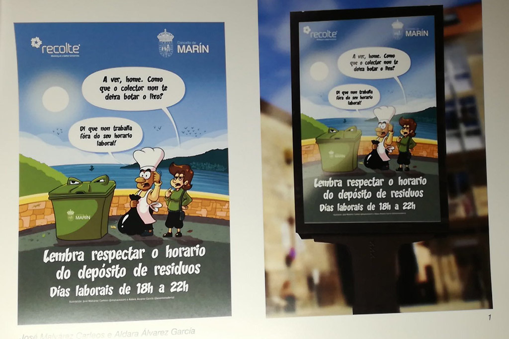 La campaña se llevará a cabo con carteles informativos “Mupi” y otros colocados en los transportes públicos o en las redes sociales, explicando mediante ilustraciones de José Malvárez Carleos y Aldara Álvares García con mensajes informativos al respecto de los distintos aspectos de la recogida.