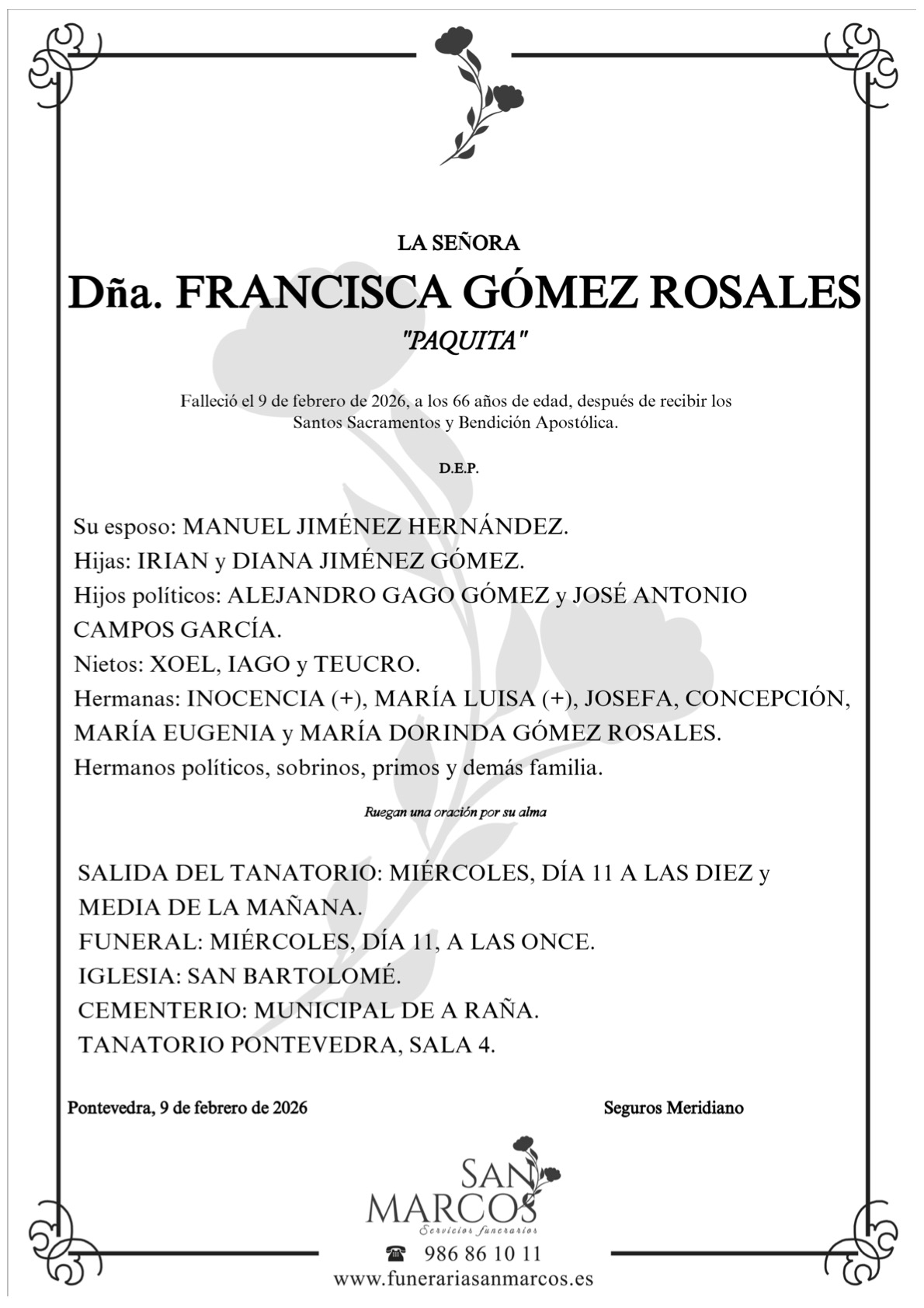 La funeraria SAN MARCOS comunica el fallecimiento, ayer día 9 de enero, de doña FRANCISCA GÓMEZ ROSALES cuyos restos mortales permanecerán en el tanatorio Pontevedra sala número 4, hasta el momento de su traslado, MAÑANA miércoles día 11 a las diez y media de la mañana al cementerio municipal del A Raña-Marín para su inhumación.