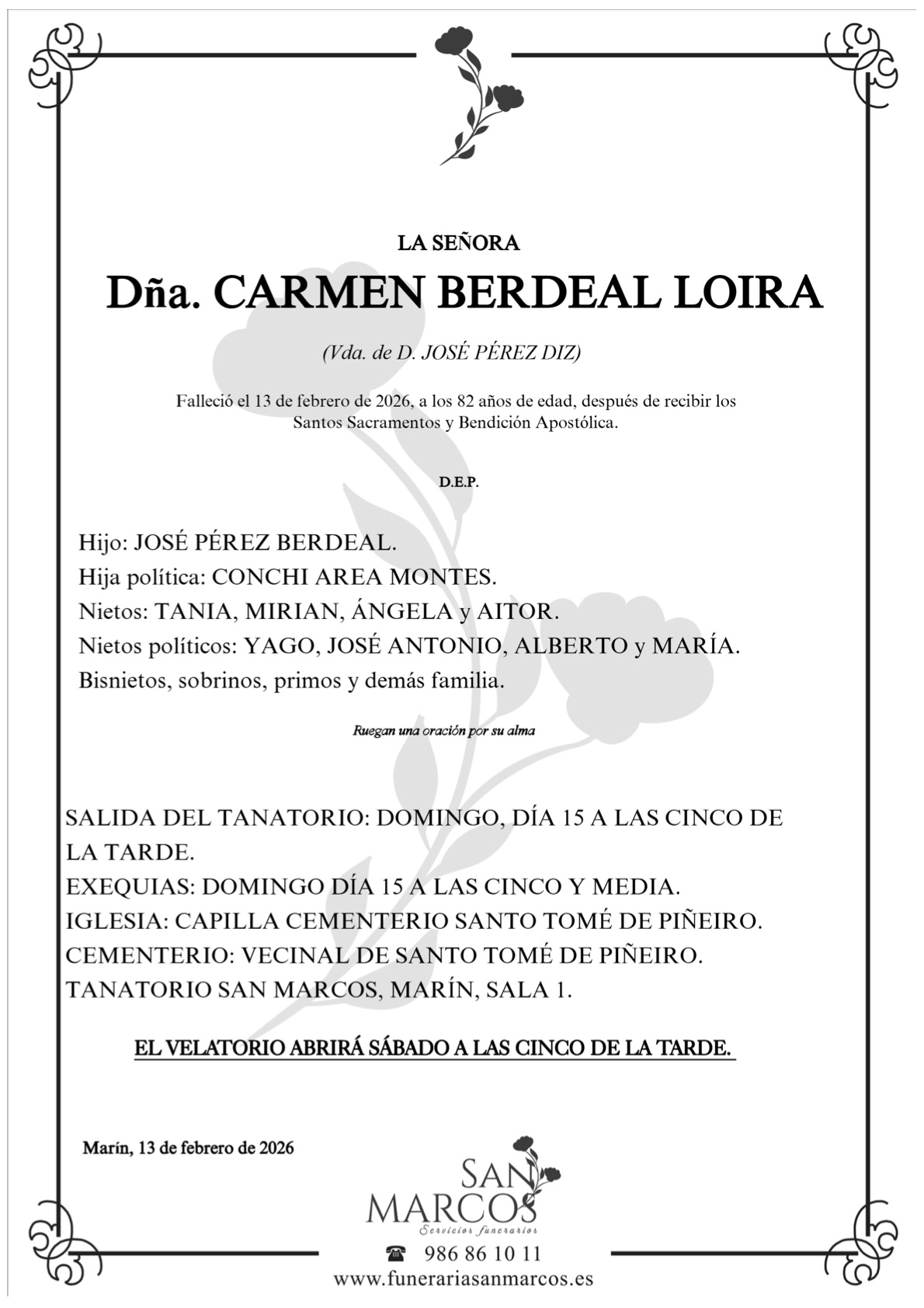La funeraria San Marcos comunica el fallecimiento hoy, día 13 de febrero, de doña CARMEN BERDEAL LOIRA cuyos restos mortales permanecerán en el tanatorio San Marcos, de Marín, sala número 1, hasta el momento de su traslado el DOMINGO día 15 a las CINCO de la tarde al cementerio vecinal de Santo Tomé de Piñeiro para su inhumación, previa la celebración de las exequias fúnebres en la capilla del propio cementerio.