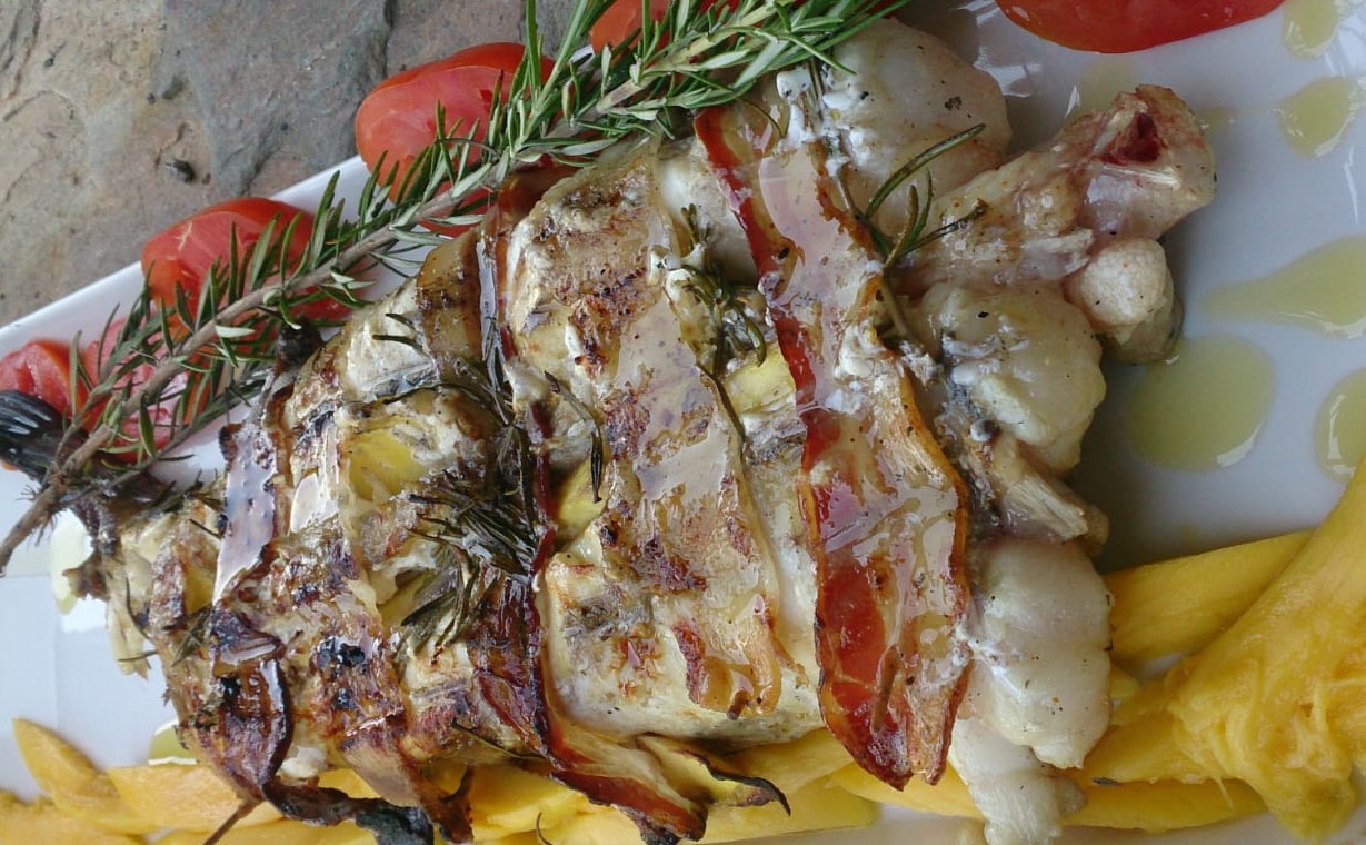 La receta de hoy se me ocurrió leyendo un libro de cocina sobre langostas. Siento no recordar el título, pero bien podría haber sido: “Cien maneras de destrozar una langosta en la cocina”. Preparaban una langosta a la brasa con mango y panceta. Entonces, me saltó la chispa e hice el siguiente razonamiento. Si los piratas de los restaurantes hacen el rape “alangostado” para dar gato por liebre en el salpicón, ¿por qué no preparar la cola de rape como si fuera una langosta directamente?