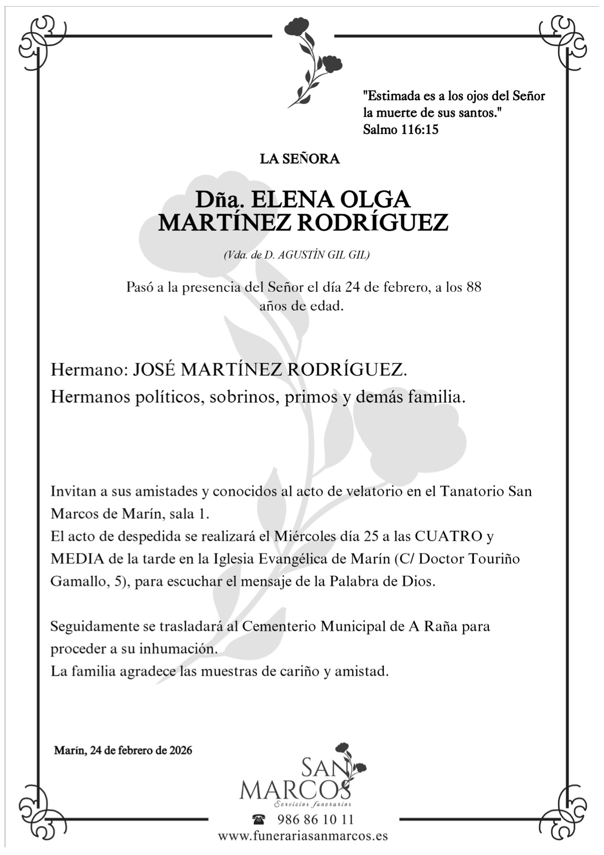 La funeraria San Marcos comunica el fallecimiento hoy, día 24 de febrero, de doña ELENA OLGA MARTÍNEZ RODRÍGUEZ cuyos restos mortales permanecerán en el tanatorio San Marcos, de Marín, sala número 1, hasta el momento de su traslado mañana MIÉRCOLES día 25 a las CUATRO Y MEDIA de la tarde la Iglesia Evangélica de Marín (C/Dr. Touriño) para escuchar la Palabra de Dios y, a continuación, al cementerio municipal de A Raña para su inhumación.