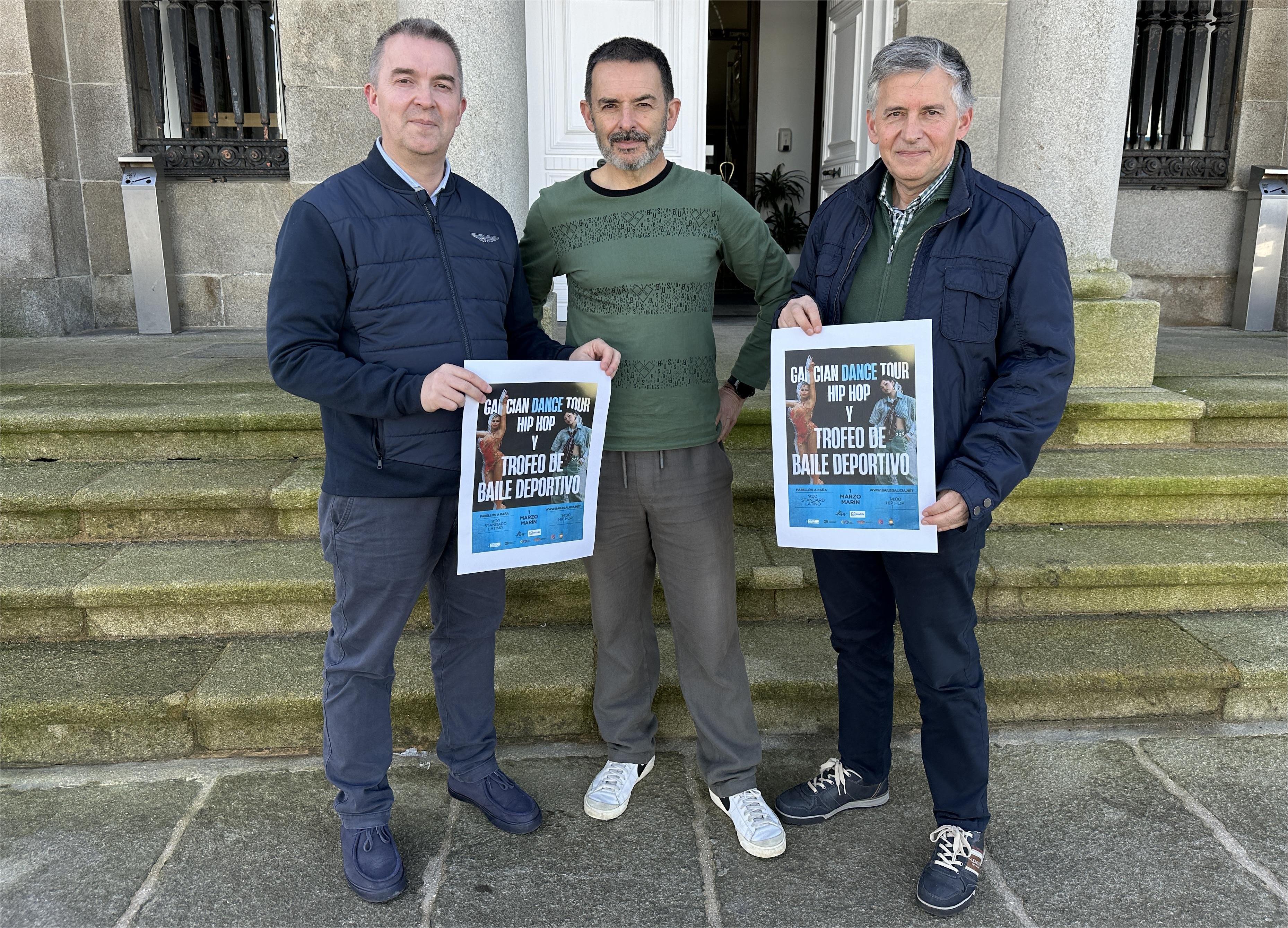 El concejal de deportes, Antonio Traba junto con Miguel Abreu, organizador del evento y el coordinador de deportes de la Xunta de Galicia Guillermo Reinaldo, presentaron ayer un singular evento deportivo y de danza, el “ Galician Dance Tour” tendrá lugar este domingo en el Pabellón polideportivo de A Raña y constituirá la primera prueba de la “Liga Galega Xunta de Galicia de Hip Hop”, en su tercer año de existencia.