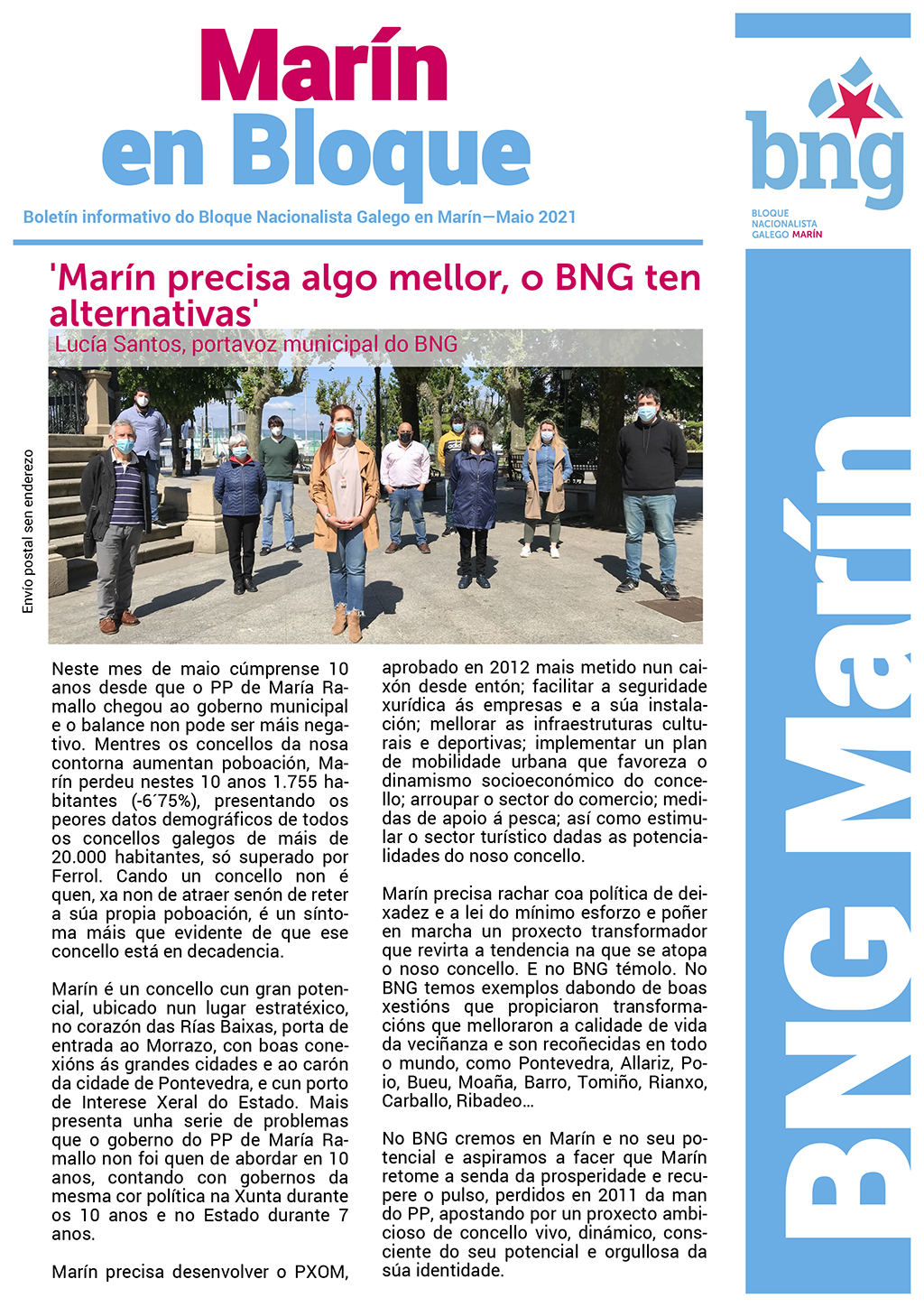 Amais, no boletín recóllense varias actuacións levadas a cabo polo BNG neste último ano, desde a publicación do anterior boletín en 2020, como son a defensa dunha Sanidade Pública de calidade, o posicionamento contrario do BNG á Zona Azul, a aposta pola promoción do patrimonio arqueolóxico, por unha maior atención ao rural e por actuacións dirixidas á mocidade.