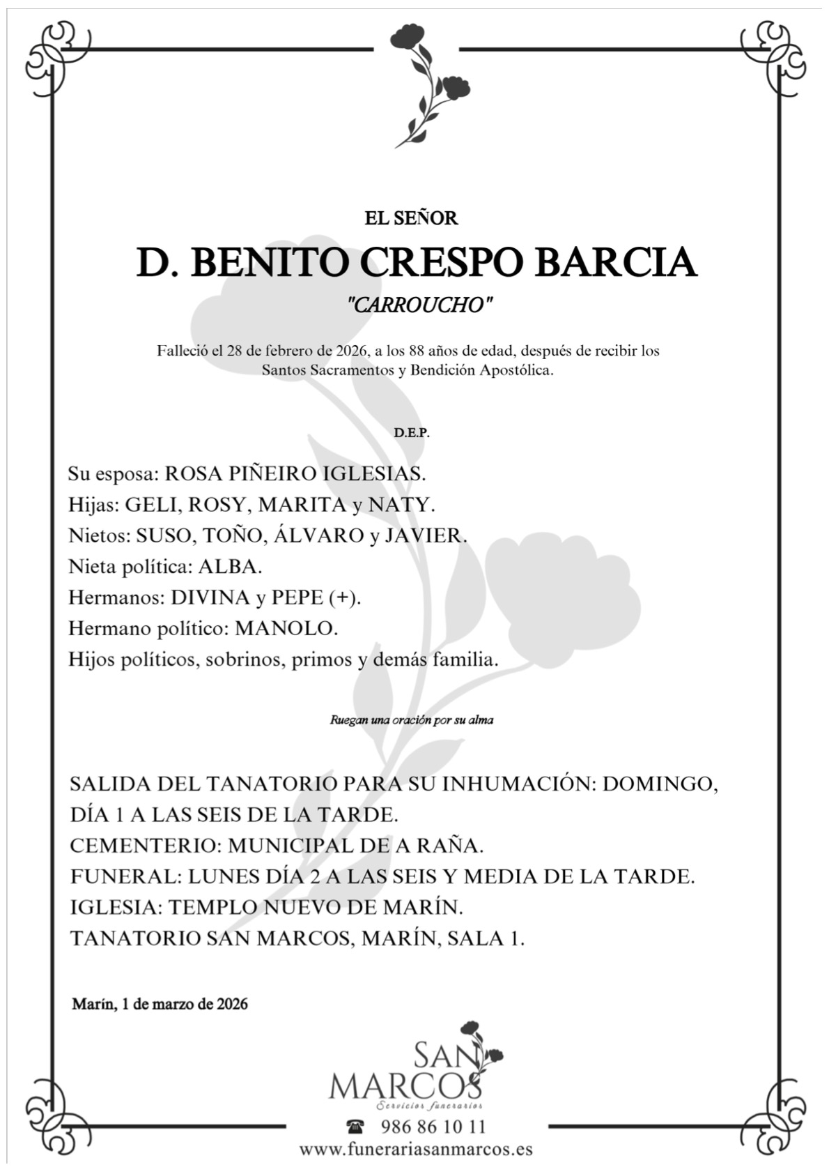 La funeraria SAN MARCOS comunica el fallecimiento ayer, día 28 de febrero, de don BENITO CRESPO BARCIA cuyos restos mortales permanecerán en el tanatorio San Marcos, de Marín, sala número 1, hasta el momento de su traslado hoy domingo día 1 a las SEIS de la tarde al cementerio municipal de A Raña para su inhumación.