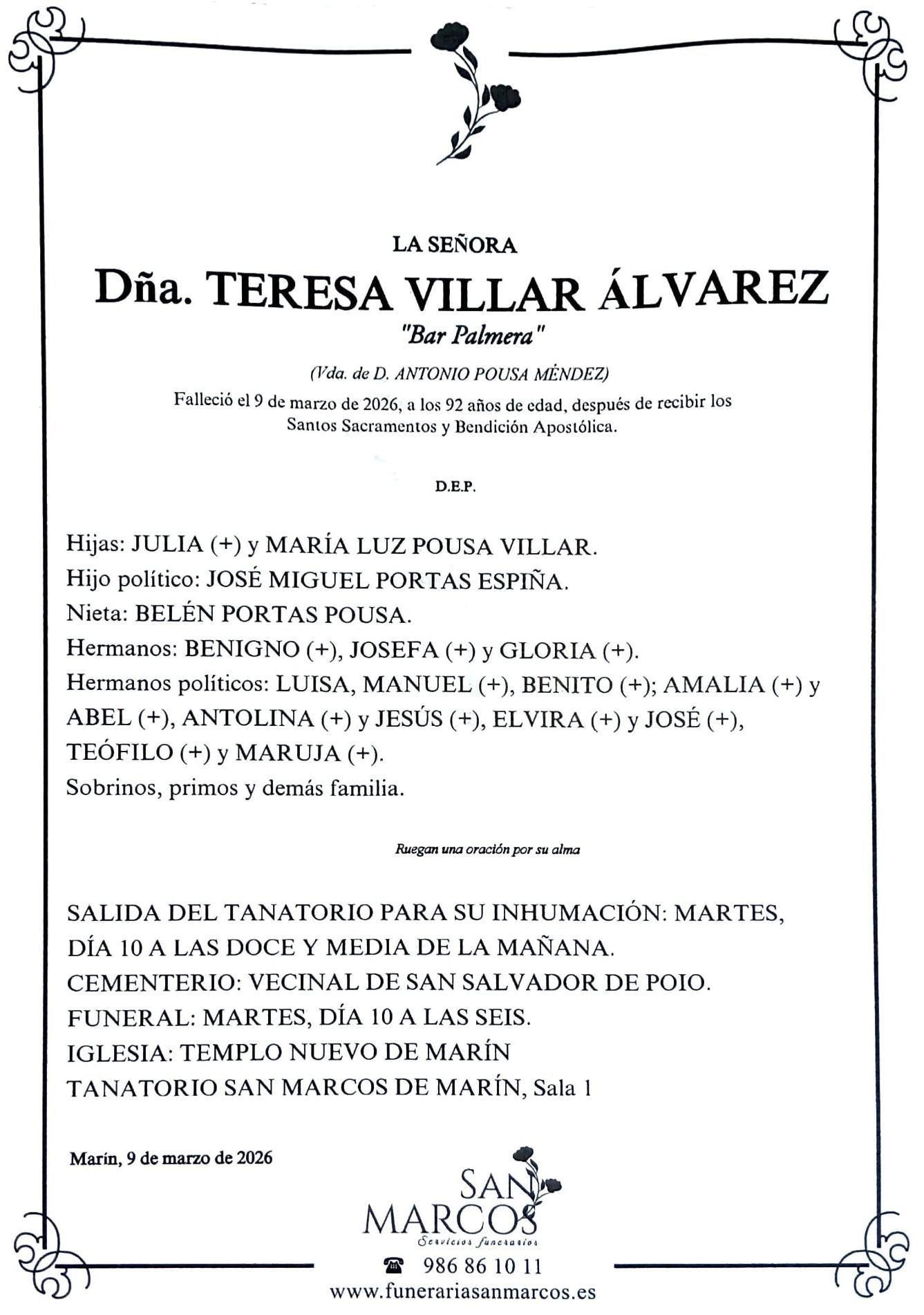 La funeraria SAN MARCOS comunica el fallecimiento hoy, día 9 de marzo de doña TERESA VILLAR ÁLVAREZ cuyos restos mortales permanecerán en el Tanatorio San Marcos, de Marín, sala número 1, hasta el momento de su traslado mañana martes día 10 a las doce y media de la mañana al cementerio vecinal de San Salvador de Poio.