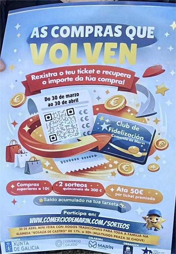 O Centro Comercial Aberto Estrela de Marín impulsará entre o 30 de marzo e o 30 de abril a campaña “As compras que volven”, unha iniciativa coa que busca incentivar o consumo no comercio local, premiar a fidelidade da clientela e reforzar o uso do Club de Fidelización Comercio de Marín.