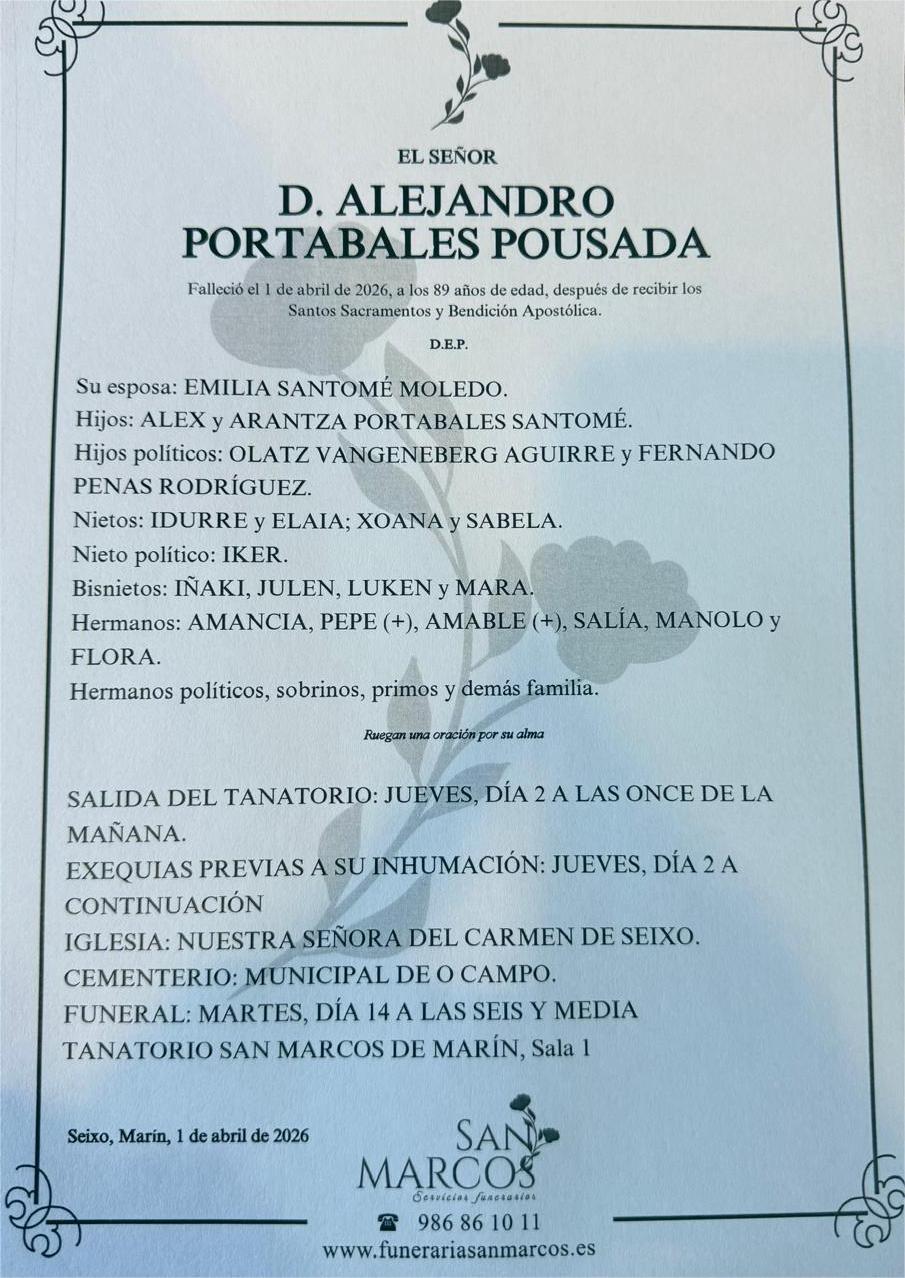 La funeraria SAN MARCOS comunica el fallecimiento hoy, día 1 de abril de don ALEJANDRO PORTABALES POUSADA cuyos restos mortales permanecerán en el Tanatorio San Marcos, de Marín, sala número 1, hasta el momento de su traslado mañana JUEVES día 2 a las ONCE de la mañana para su inhumación en el cementerio municipal de O Campo.