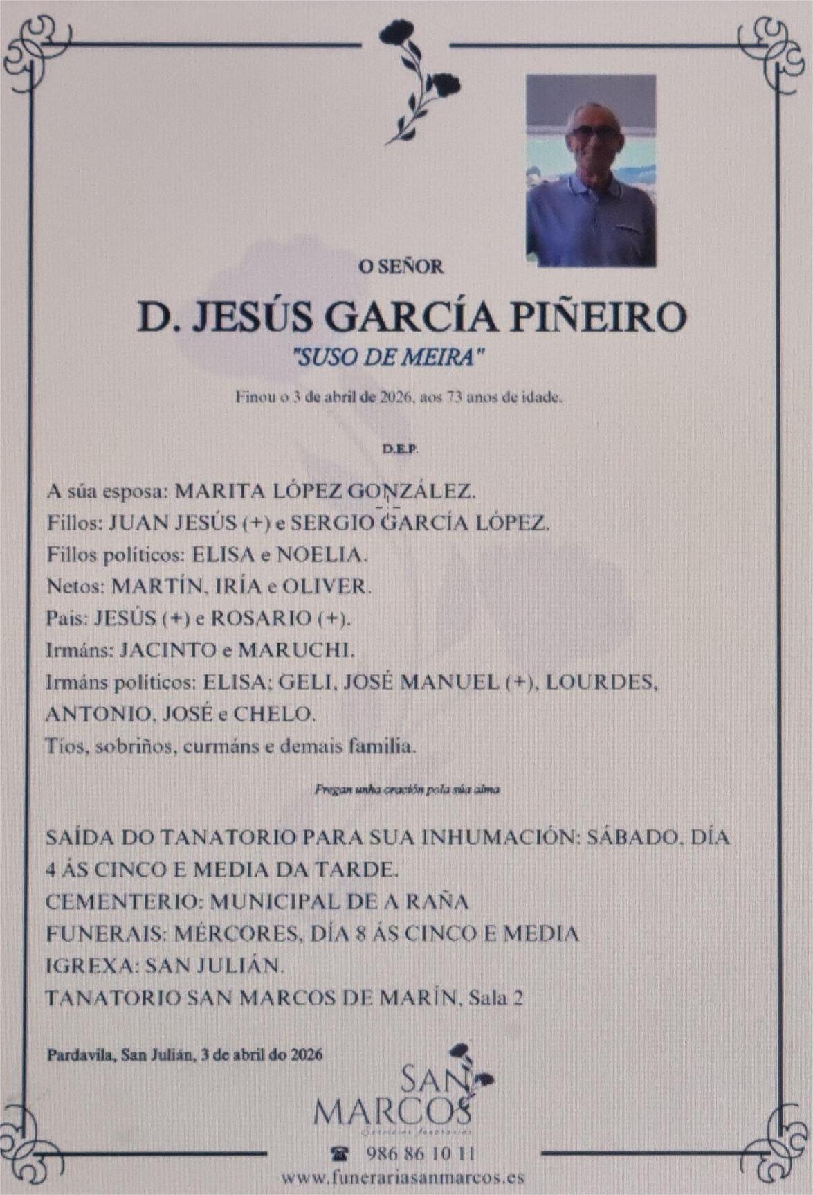La funeraria SAN MARCOS comunica el fallecimiento hoy, día 3 de abril de don JESÚS GARCÍA PIÑEIRO cuyos restos mortales permanecerán en el Tanatorio San Marcos, de Marín, sala número 2, hasta el momento de su traslado mañana SÁBADO día 4 a las CINCO Y MEDIA de la mañana para su inhumación en el cementerio municipal de A RAÑA