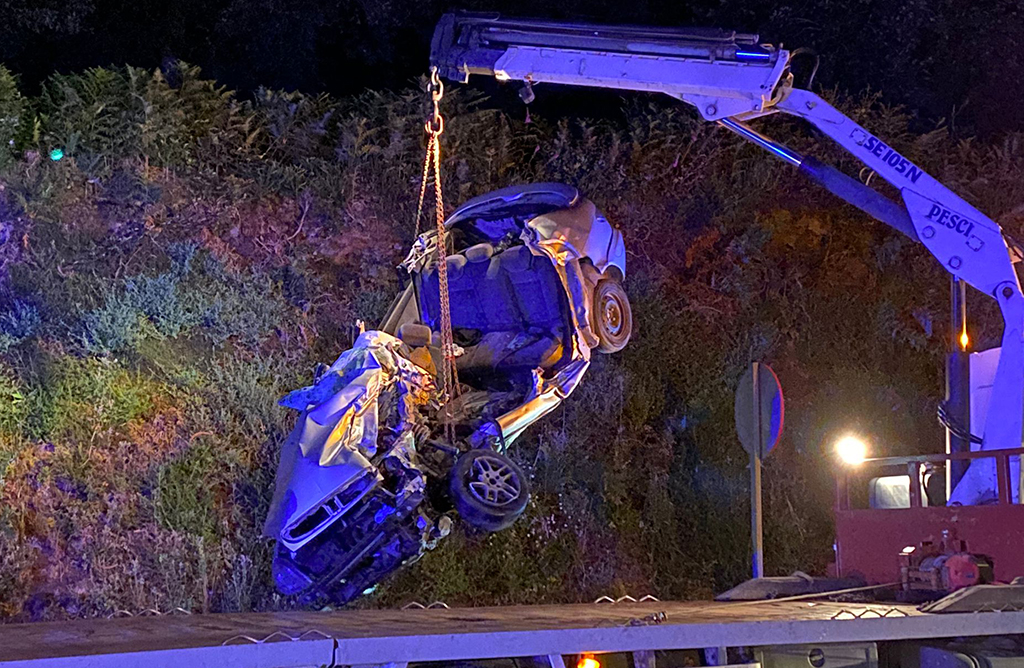 El coche, totalmente destrozado, es izado a una plataforma por la pluma de la grúa