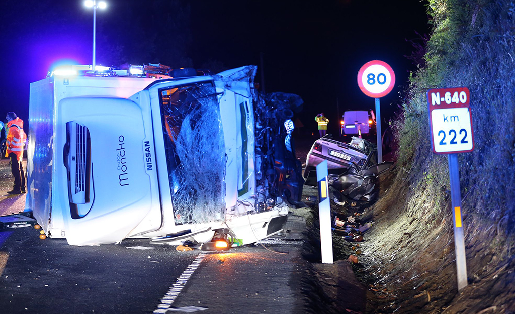 Un grave accidente con tres personas fallecidas se produjo a primera hora de esta madrugada en el Kilómetro 222 de la N-640 dirección Cuntis, cuando un turismo y un camión chocaron de modo frontolateral. Los tres fallecidos viajaban en el turismo, que se llevó la peor parte del impacto, y el camión quedó semi volcado sobre la vía.