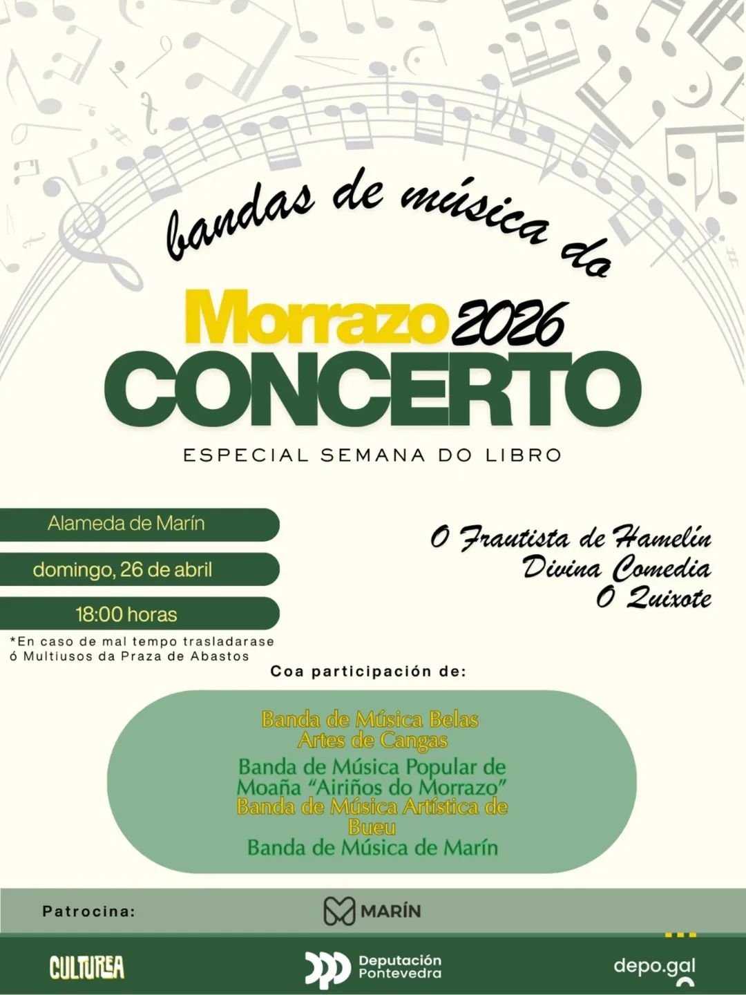 Y para el domingo día 26 se anunica el concierto “Especial Semana do Libro” de bandas de música que concentraràn a cuatro agrupaciones del Morrazo; la “Belas Artes”, de Cangas, “Airiños do Morrrazo”, de Moaña, “Artística” de Bueu y la anfitriona, “Banda de Música de Marín.