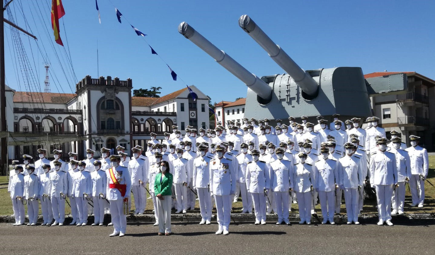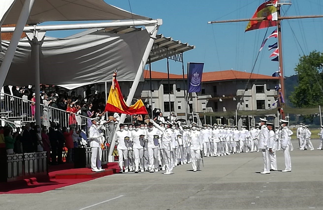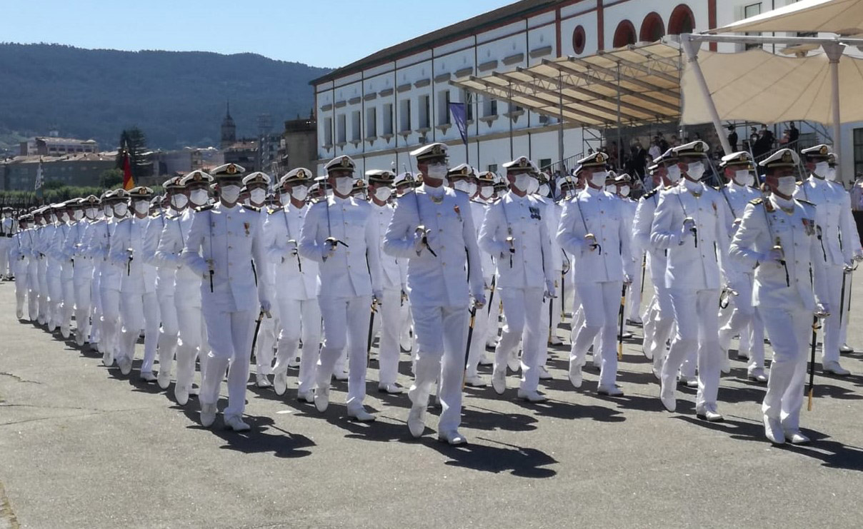 Margarita Robles, Ministra de Defensa, presidió junto al vicepresidente de la Xunta de Galicia y la alcaldesa de Marín, así como con altos cargos de la Armada, el acto de entrega de despachos a los nuevos oficiales que terminaron sus estudios en la academia marinense y también el de la Jura de Bandera de los aspirantes que, a partir del próximo curso, serán ya guardiamarinas en vías de conseguir dentro de cuatro años igualmente sus primeros destinos en las distintas unidades de la Armada. Ciento dieciocho entre los cuales había 10 mujeres, son ya nuevos oficiales y 80, y entre ellos 10 damas, juraron su compromiso con la defensa de la Bandera de España que presidió con la habitual respeto la ceremonia castrense a la que no le faltó ningún detalle con respecto a las habituales en años sin pandemia y que finalizó con el acto de homenaje a los caídos, el canto del Himno de la Armada y el desfile del batallón de alumnos participantes tras cuyo paso se dio por terminado el acto.