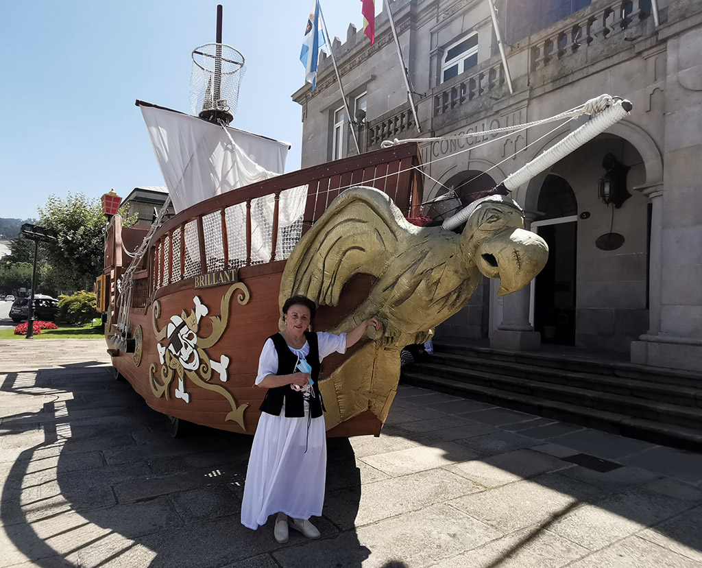 Una marinense posa en el barco corsario instalado ante el Concello de Marín