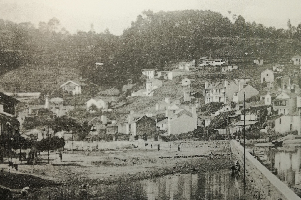 La plaza se construyó en este triángulo. Delante el Río Lameiriña