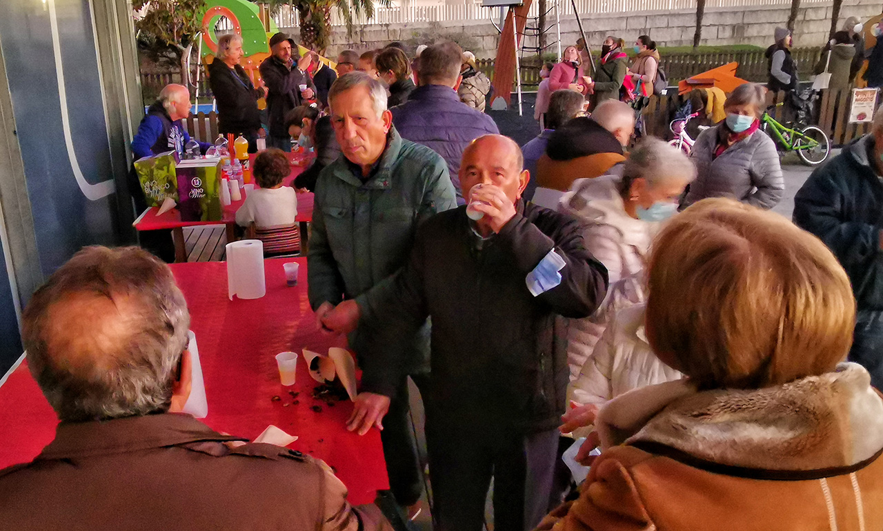 Por mesas perfectamente ubicadas para hacer el reparto de las castañas, las bebidas y la queimada, fueron rotando los asistentes que disfrutaron en primer lugar, y sobre todo, del buen trabajo realizado por el personal de “Dibay Eventos” con Sito Santiago al frente y utilizando uno de los hornos específicos para esta misión que llevan allí donde se les llama para celebrar el ya tradicional magosto.
