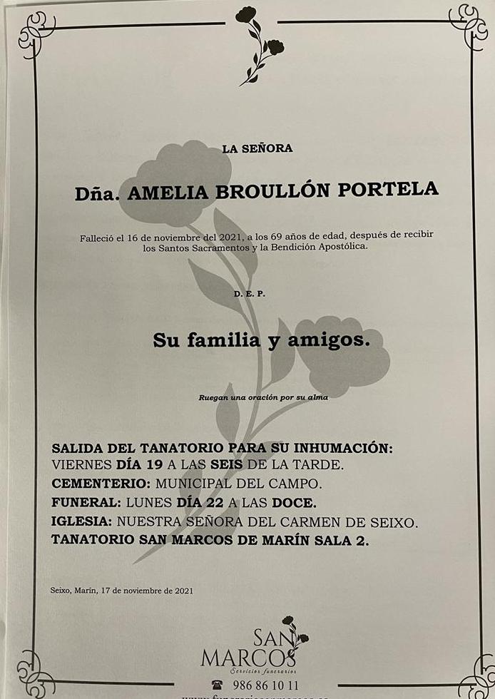 Los restos mortales de Amelia Broullón se encuentran en el Tanatorio San Marcos de Marín y allí permanecerán hasta el próximo viernes día 19 cuando, a las seis de la tarde, serán trasladados al cementerio municipal del Campo donde recibirán cristiana sepultura.