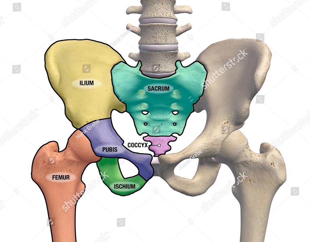 En esta ilustración tenéis la Pelvis con los huesos y articulaciones que la forman. Importantísimo que le prestemos atención porque, como veis, sirve de unión del tronco con las piernas, e importante también porque es el sostén de la columna vertebral. En ella están los órganos reproductores masculinos y femeninos, del bajo vientre y por ahí también saldrán los futuros bebés.