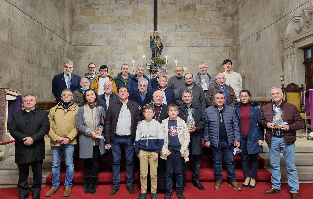 La Cofradía del Nazareno para celebrar su longeva existencia ha venido entregando a cada uno de los obispos asistentes en los días anteriores, una reproducción de la imagen del Nazareno que se venera en esta parroquia. Ayer, con la presencia de Don Julián, fue un día especial y por ello se rindió homenaje a los cofrades que se han venido destacando por sus presidencias anteriores o colaboraciones con el colectivo y, todos ellos, junto con el Obispo y el párroco de Marín, recibieron el testimonio de la celebración de los setenta años de existencia de esta comunidad parroquial marinense.