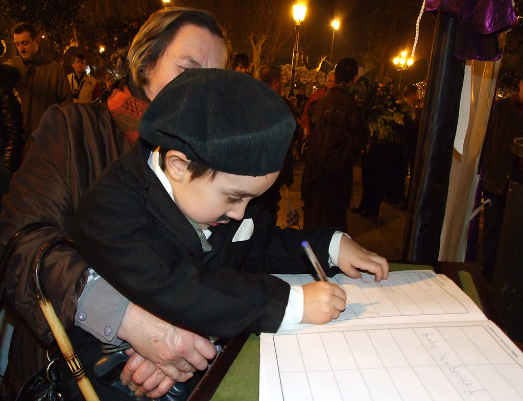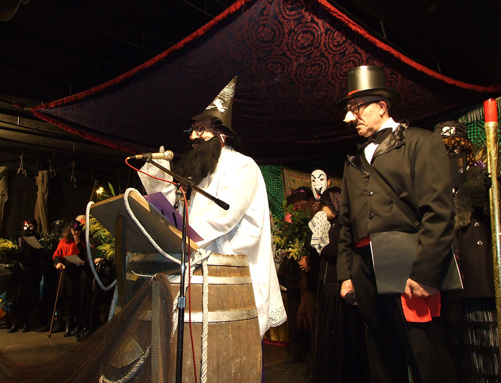 Chegados ao palco ubicado na Praza de España, o frade maior leu o pregón da sardiña, ¡¡¡Chorade!!! gritaba de parágrafo en parágrafo ata o final da intervención. O Bispo iniciou o “rezo” da centenaria ladaíña que vai desde “un ollón / dous ollóns / tres ollóns /catro ollóns/ e sinco ollóns/ , ata invocar a canto peixe hay no mar mentras o público respondía “eso para nos” ou “Iso para vos” segundo a calidade dos peixes invocados.