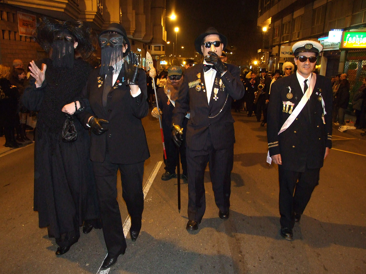 A saída do antiguo Ateneo foi ás oito en punto da tarde como manda a tradición e, despois do velatorio no palco da música. A comitiva precedida de cornos, botafumeiros de zufre, estandartes das cofradias de canto peixe hai, o catafalco coa pobre sardiña do ano e, tras del, o bispo e os seus “colitos”; autoridades, banda de música, choronas e demáis, percorreu as rúas de Marín onde se amontonaban os curiosos daquí e de fora que arrepiados escoitaban os gritos das viuvas edulcorados coa música da banda ¡e que banda!, presidida polo célebre director “Boneti”, ataviado das mellores galas.