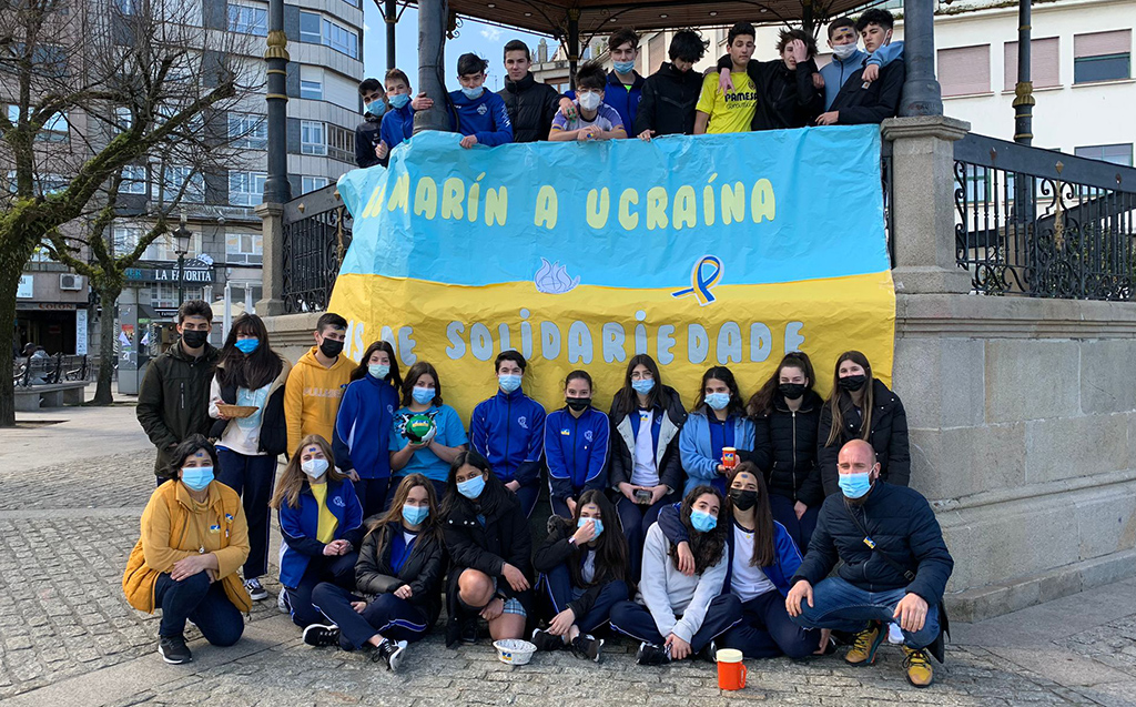 Tal y como informábamos en días pasados y después de haberse pospuesto en un par de oportunidades por motivos de la climatología, el acto en favor de los refugiados ucranianos organizado por el Colegio Inmaculada pudo celebrarse en la mañana de ayer en las inmediaciones del Parque Eguren. El nivel de colaboración del pueblo marinense fue máximo y el objetivo económico se cumplió en mucho menos tiempo del previsto; al final de la campaña, los participantes posaron para la imagen con dos palomas hechas con monedas símbolo de la pretendida PAZ y reivindicando que de una vez concluya esta barbarie.