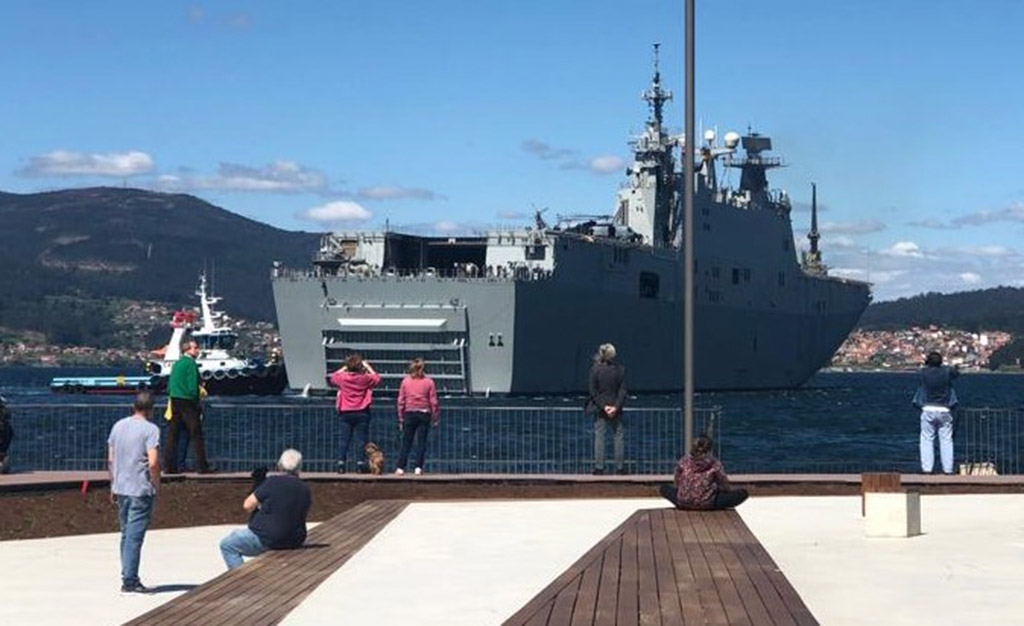El buque Juan Carlos I hizo su entrada a las cinco de esta tarde en el muelle comercial del Puerto de Marín con apoyo de la empresa de amarradores y remolcadores Amare Marín en la primera visita de su existencia a la rada marinense. Había entrado en la Ría de Pontevedra en la mañana de ayer miércoles para realizar pruebas con el Centro de Medidas Electromagnéticas situado dentro de la Escuela Naval Militar, y está prevista su partida el viernes a primera hora de la tarde.