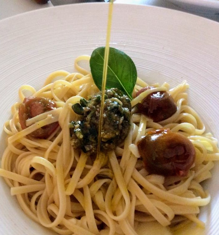 Una vez que conseguimos la característica salsa, podéis buscar en nuestra Carriola la receta de pasta fresca que hicimos hace unos meses y atreveros a hacerla para añadirle vuestro pesto. Si no tenéis tiempo o no queréis complicaros, también podéis comprar un paquete de espaguetis, cocerlos, enfriarlos debajo del grifo en un escurridor y reservarlos en el frigorífico. Cuando vayáis a tomarlos, los calentáis en una sartén con aceite de oliva virgen extra “Aires de Jaén” y ajo al gusto, y le añadís un poco de agua de la cocción que ayudará a ligar la salsita.