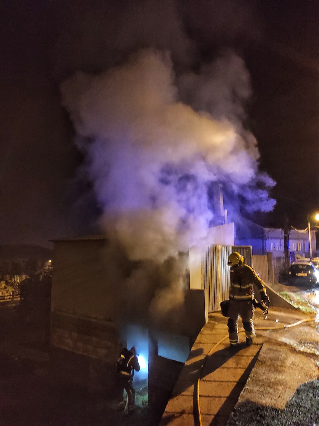 Inicio de la madrugada del viernes. Se activan las alertas desde el centro de coordinación CIAE 112 de Galicia, que moviliza a los bomberos, Policías Local y Nacional del municipio marinense y a Protección Civil, que se desplaza después de terminar la limpieza de la vía en un accidente relativamente cercano, la subida al Lago de Castiñeiras. La Policía Local sale de su centro, detrás del Concello, con todos los medios disponibles, dos coches-patrulla con dos efectivos cada uno. Llegan al lugar del incendio, donde ya el galpón afectado ha alcanzado una temperatura considerable que le hace imposible con sus escasos medios extinguir el fuego sin ayuda de los Bomberos de O Morrazo.
