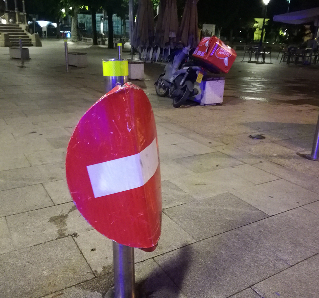 Estado en el que quedó la señal de tráfico contra la que impactó la moto de reparto