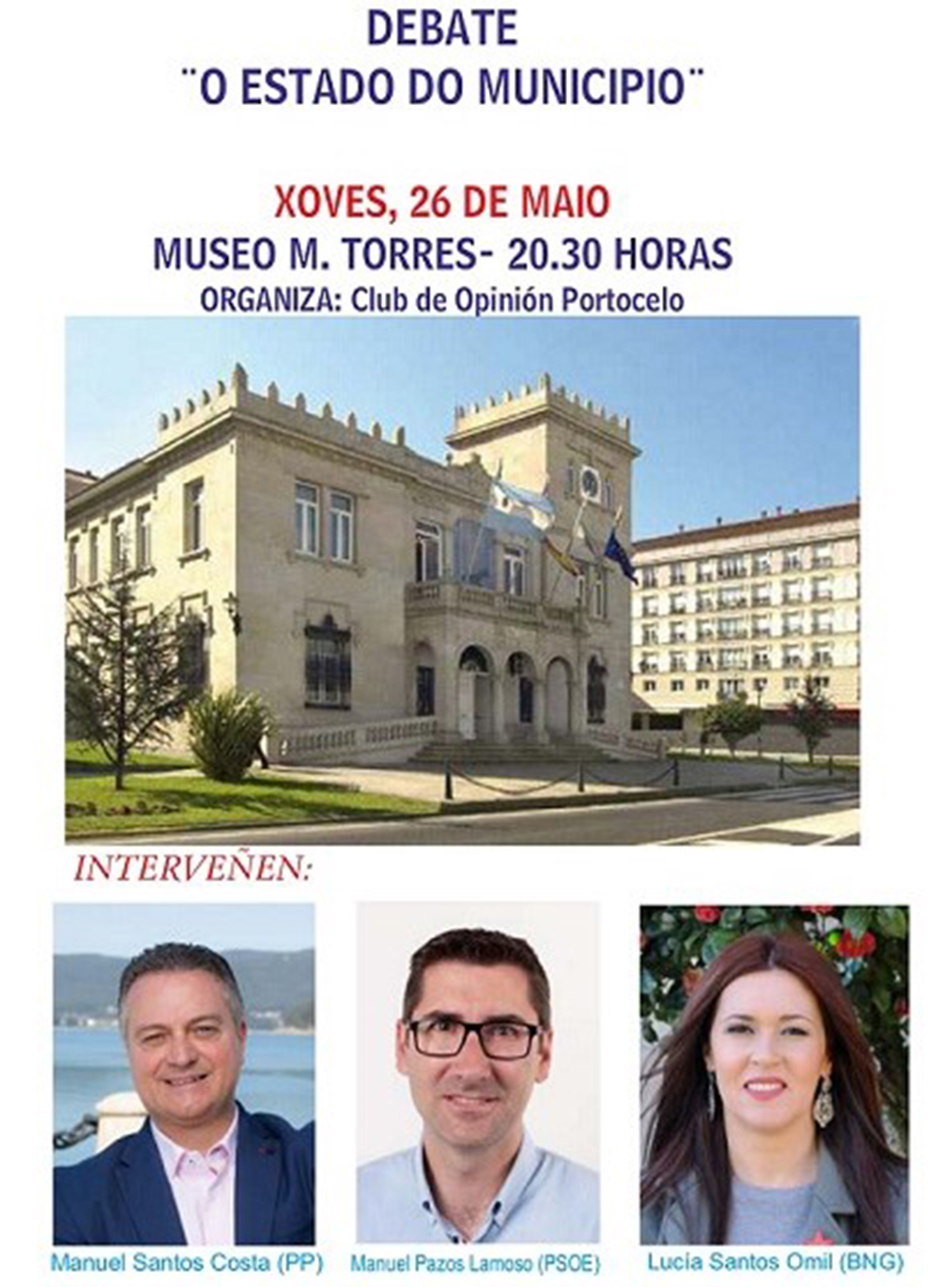 El Club de Opinión Portocelo que dirige Ángel García Carragal, organiza mañana, día 26, en el salón de actos del Museo Torres un interesante cruce de opiniones entre los representantes de los partidos que forman la corporación municipal, PP, PSOE y BNG que, serán Manuel Santos Costa, Manuel Pazos Lamoso y Lucía Santos Omil, respectivamente.