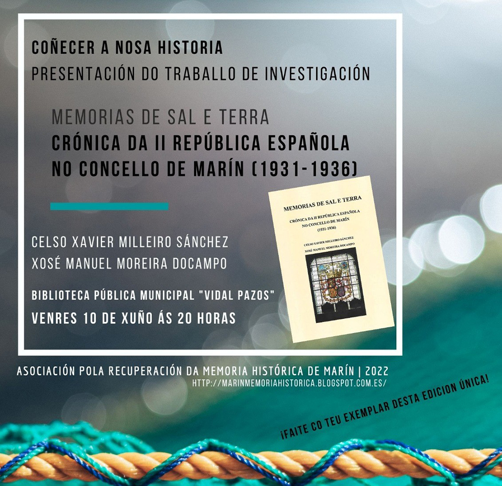 A “Asociación para a Recuperación da Memoria Histórica” de Marín que preside Queta Molas organiza para esta tarde na Biblioteca Pública Vidal Pazos un acto de presentación dun traballo de investigación sobre “Memoria de Sal e Terra, crónica da II República Española no concello de Marín 1931-1936” traballo dos autores Celso Xavier Milleiro Sánchez e Xosé Manuel Moreira Docampo.